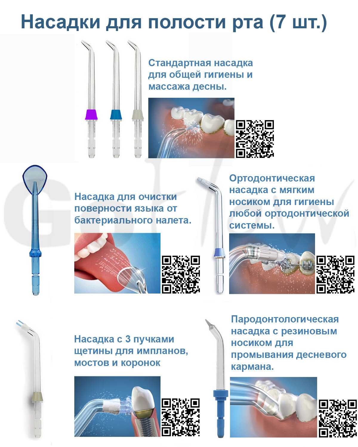 Тип насадки : | для ежедневной чистки, для имплантов, для чистки языка, ортодонтическая, пародонтическая насадка |