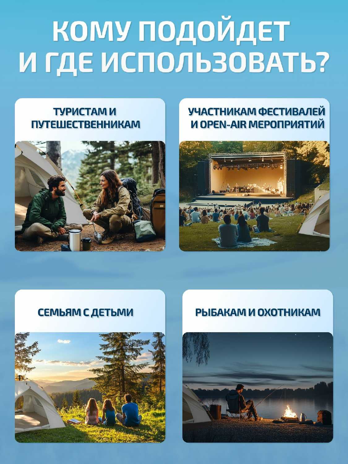 - + Поставить и убрать палатку заняло по времени 2 минуты. Достаточно прохладная внутри. Просторная.