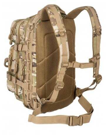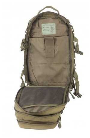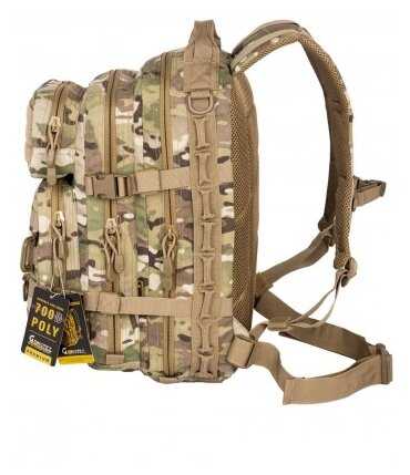 общее количество ячеек системы Молле (Molle) - в 4-х группах 16+4+16+8=44 шт, оборудованы: передняя боковые и нижняя стороны, тип - стандартный простроченная нейлоновая стропа, рюкзак укомплектован двумя массивными съемными карабинами с застежками и подвижным кольцом на систему Молле, место под патч 16Х75 см
