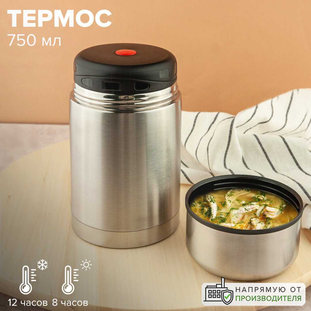 При предварительном прогреве колбы кипятком (10-15 минут) и заполнении до горловины, термос поддерживает температуру первых блюд 6-8 часов. Например, суп, залитый в 7:00, остаётся обжигающе горячим к 13:00-14:00. Для вторых блюд теплоудержание ниже – через 4-5 часов еда становится тёплой, но не горячей. -