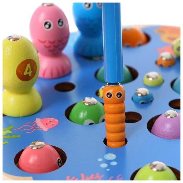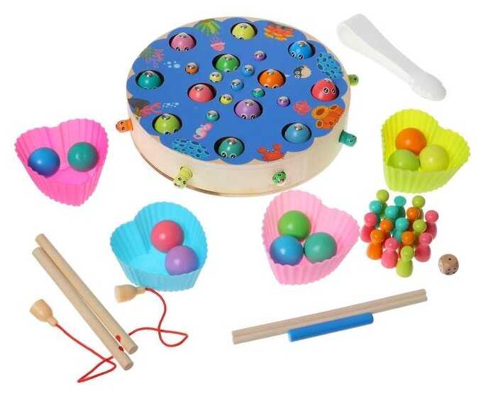 Комплектация : | двустороннее игровое поле, 4 формы, 16 пешек и кубик, пинцет, палочки, удочка, 12 рыбок, 10 шариков, 17 червячков |