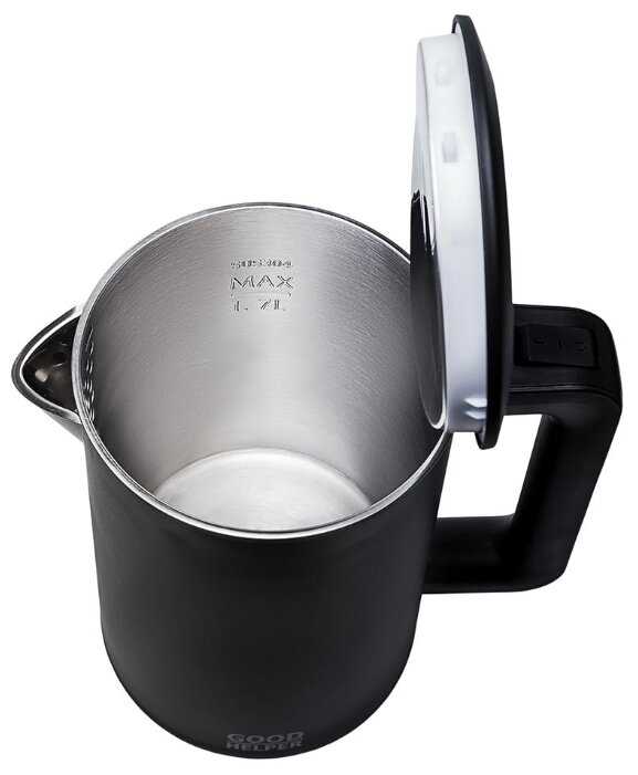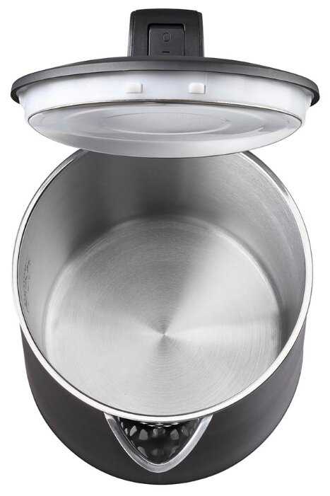 Прекрасный чайник за свои деньги. Искала именно чёрный матовый. Есть световая индикация (синий) при включении. Внутри всё полностью металлическое, крышка открывается на 90 градусов, удобно из фильтра наливать воду! Единственное, не видно уровень воды, но меня это абсолютно не смущает. Работает тихо, греет быстро, кнопочка отщелкивается не громко. Супер чайник!