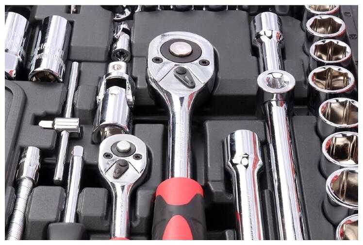 - + Брали набор в качестве расходника для сервиса. И он оказался довольно неплохим. В нем 2 трещотки, торцевые головки разного размера, карданные шарниры, ключи, отвертки и другие мелочи. Случайно уронили кейс и он не разбился).