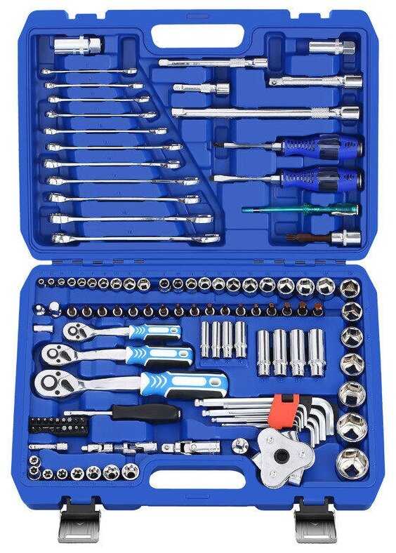 Инструменты в комплекте : | вороток для головок, ключ разводной, ключи гаечные, ключи имбусовые (шестигранные), отвёртки, пассатижи, плоскогубцы, рукоять для головок, трещотка |
