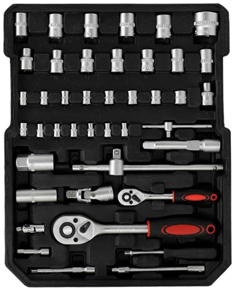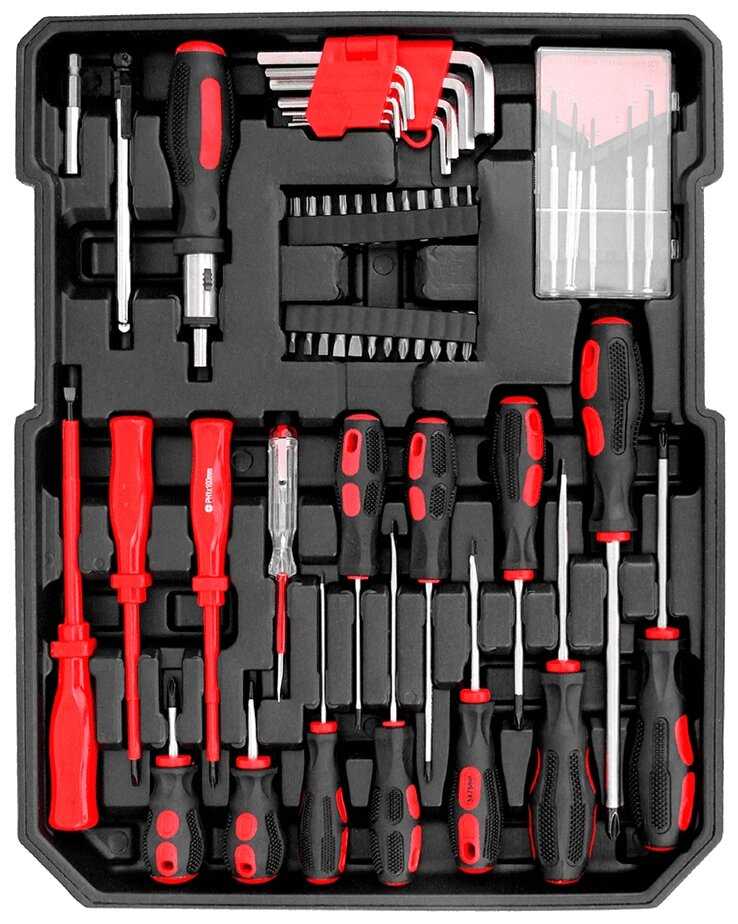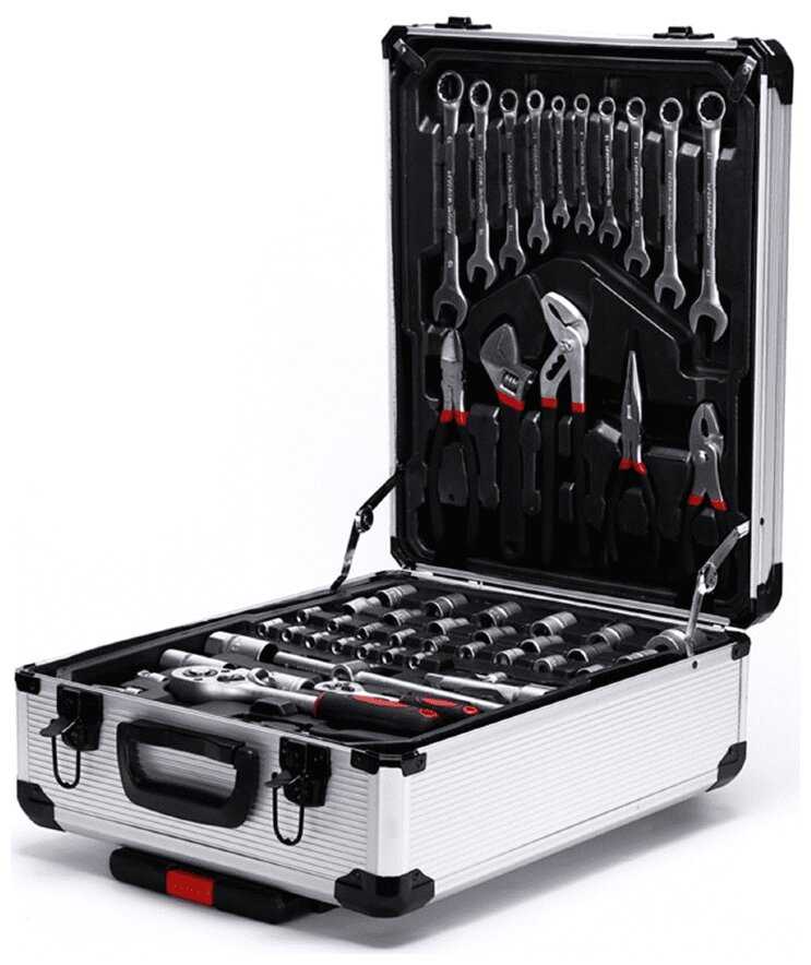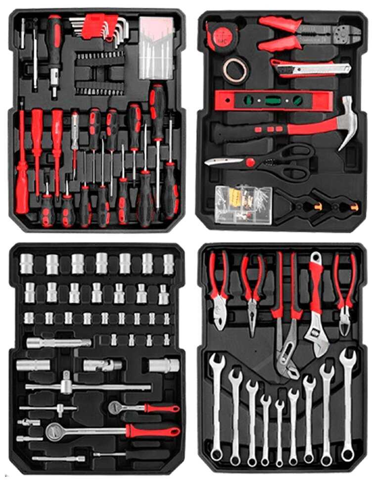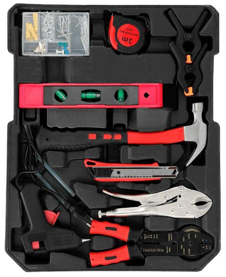 Комплектация выглядит внушительно, но страдает от ошибок: например, вместо клещей вложены ножницы, а ключи представлены только чётными размерами. Это создаёт неудобства при ремонте автомобиля, где часто требуются нестандартные размеры. При этом набор включает редкие инструменты (типа клеевого пистолета), которые могут пригодиться в быту. Фиксация инструментов в резиновых держателях недостаточно надёжна — при встряске они выпадают, что особенно критично при перевозке в багажнике.