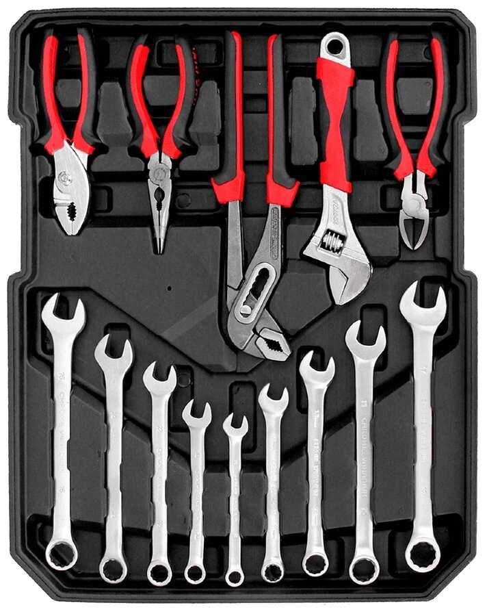 Инструменты в комплекте : | бокорезы, вороток для головок, длинногубцы, клещи для снятия изоляции, клещи переставные, ключ разводной, ключи гаечные, ключи имбусовые (шестигранные), молоток, отвёртки, отвёртки для точных работ, пассатижи, трещотка |