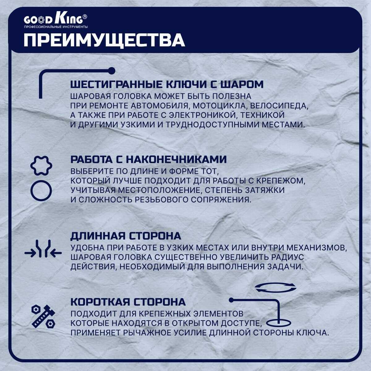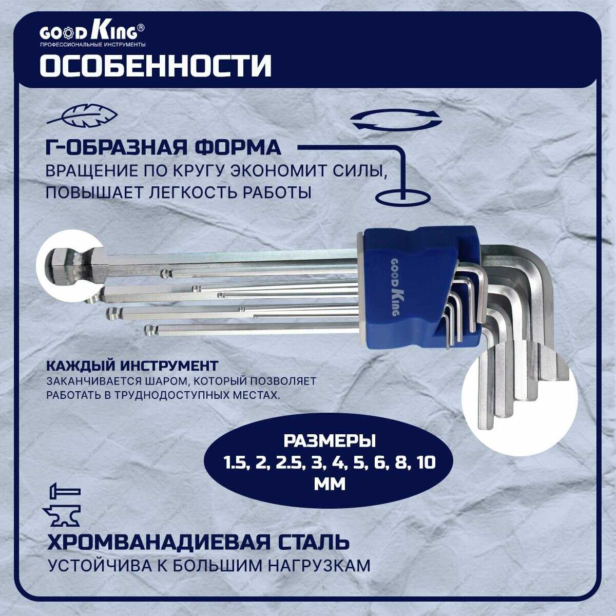 Дополнительная информация : | Угловые имбусовые ключи HEX (Г-образные) - 9шт размеров:HEX 1.5, 2, 2.5, 3, 4, 5, 6, 8, 10 мм. Ручка для ключа - 1шт |