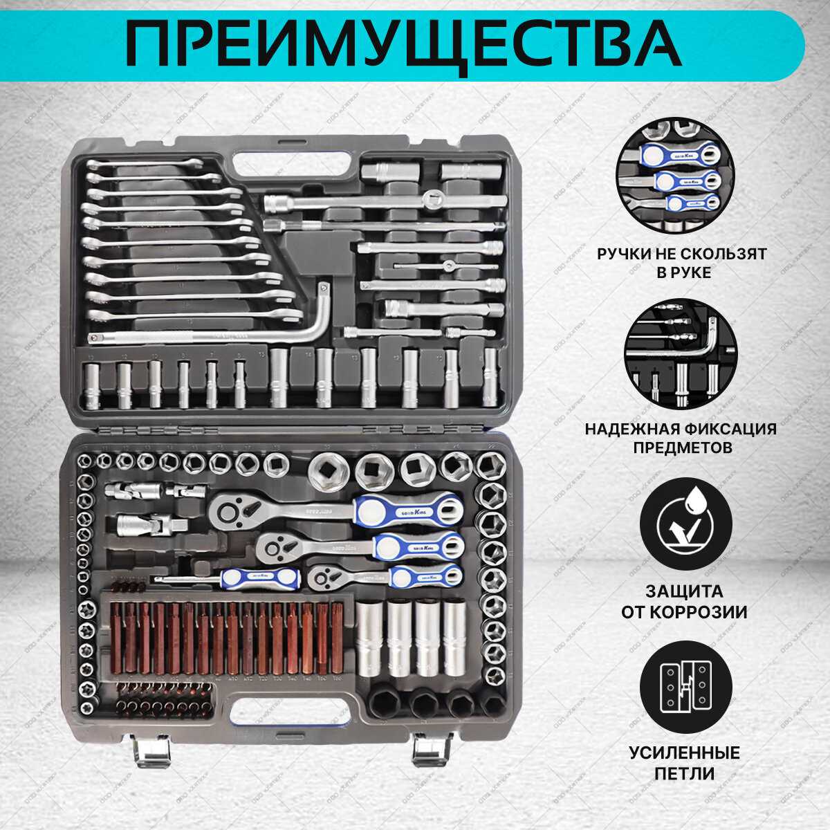 | Дополнительная информация : | ТОРЦЕВЫЕ ГОЛОВКИ И ПРИНАДЛЕЖНОСТИ 1/2" 13 шт. - Головки 6-гранные: 14, 15, 16, 17, 18, 19, 20, 21, 22, 24, 27, 30, 32 мм 2 шт. - Удлинители: 125, 250 мм 1 шт. - Трещотка: 250 мм, 72 зубца 1 шт. - Кардан: 70 мм 4 шт. - Головки 6-гранные ударные: 17, 21. 22 мм 4 шт. - Головки 6-гранные удлиненные: 17, 22 мм 1 шт. - Вороток Г-образный: 265мм 1 шт. - Скользящий адаптер: 1/2"x 3/8” ТОРЦЕВЫЕ ГОЛОВКИ И ПРИНАДЛЕЖНОСТИ 3/8" 9 шт. - Головки 6-гранные: 10, 11, 12, 13, 14, 18 мм 6 шт. - Головки 6-гранные удлиненные: 8, 10, 15 мм 2 шт. - Головки 6-гранные свечные: 16, 21 мм 6 шт. - Головки Е-стандарт: E8, E10, E11, E12, E14, E16 мм 2 шт. - Удлинитель: 150, 250 мм 1 шт. - Трещотка: 200 мм, 72 зубца 1 шт. - Адаптер: 3/8”x 1/2“ 1 шт. - Кардан: 55 мм 1 шт. - Вороток Т-образный: 155 мм 1 шт. - Адаптер бит 6-гранный: 5/16" (27 мм) ТОРЦЕВЫЕ ГОЛОВКИ И ПРИНАДЛЕЖНОСТИ 1/4" 8 шт. - Головки 6-гранные: 6, 7, 8, 9, 13 мм 6 шт. - Головки 6-гранные удлиненные: 6, 13 мм 2 шт. - Удлинители: 50 мм, 100 мм 1 шт. - Трещотка: 160 мм, 72 зубца 1 шт. - Отвертка-вороток: 150 мм 1 шт. - Вороток Т-образный: 110 мм 1 шт. - Кардан: 40 мм 1 шт. - Держатель бит: 25 мм 1 шт. - Адаптер: 1/4“x 3/8” 1/4" ГОЛОВКИ СО ВСТАВКАМИ 3 шт. - SLOTTED: S4, S5.5, S7 2 шт. - PHILLIPS: PH1, PH2 7 шт. - TORX: T8, T10, T15, T20, T25, T30, T40 4 шт. - HEX: H3, H4, H5, H6, БИТЫ 1/4" 2 шт. - POZIDRIVE: PZ1, PZ2 2 шт. - TORX: T8, T10 БИТЫ УДЛИНЕННЫЕ 5/16" 5 шт. - HEX: H6, H7, H8, H10, H12 5 шт. - SPLINE: M5, M6, M8, M10, M12 6 шт. - TORX: T20, T40, T45, T50, T55 КЛЮЧИ 3 шт. - Ключи шестигранные: 1.5, 2, 2.5 мм 10 шт. - Ключи комбинированные: 8, 19 мм ПРОЧИЕ ИНСТРУМЕНТЫ Ударопрочный кейс: 470x345x95 |