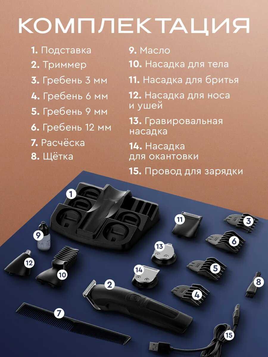 В комплект входит сам триммер, набор насадок для стрижки волос разной длины, бороды и тела, отдельные насадки для носа/ушей и точного бритья. Также включены подставка для хранения насадок, масло для смазки лезвий, щёточка для чистки и зарядное устройство с USB-интерфейсом. Некоторые пользователи отдельно отмечают наличие расчески, что повышает универсальность набора. -