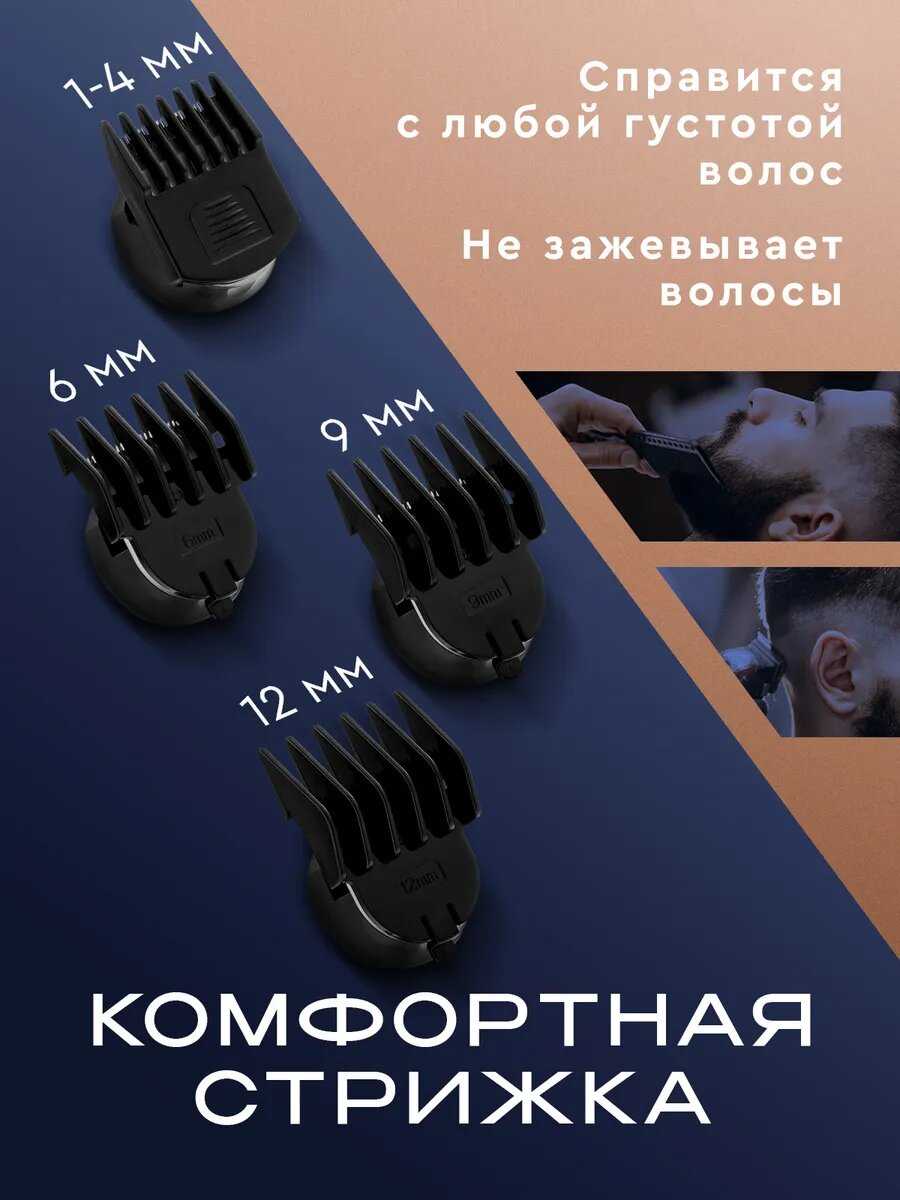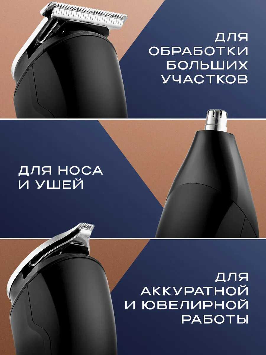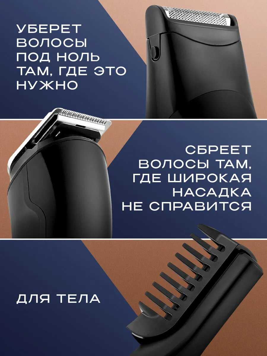 - Специализированные насадки для бороды, тела, контурирования и точного бритья с шагом регулировки длины 0.5 мм.
