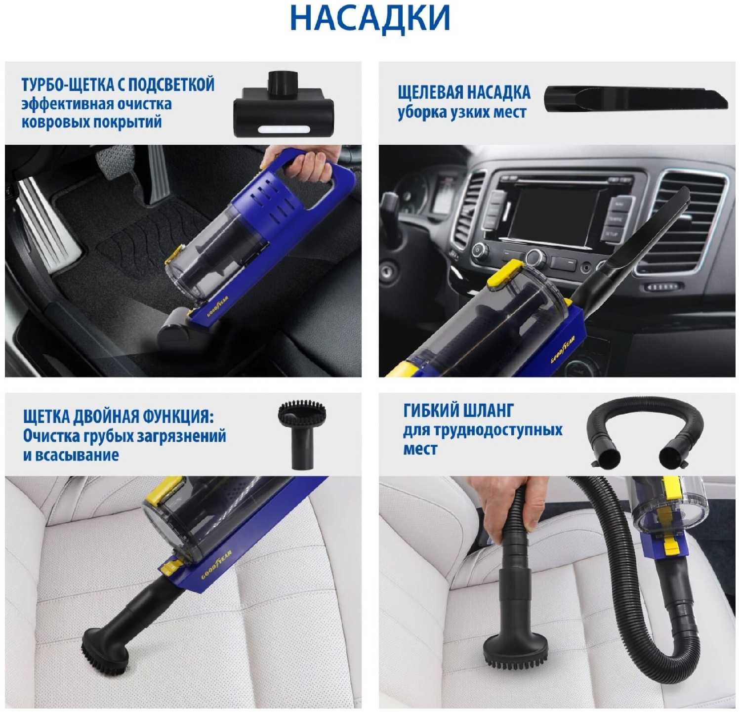 Встроенный мотор турбощетки обеспечивает вращение ворса, что позволяет глубоко очищать текстильные поверхности. Пользователи особо отмечают её эффективность против шерсти домашних животных на сиденьях и ворсовых ковриках. Щетка бережно обрабатывает материалы без повреждений, а подсветка помогает убирать в затемненных участках салона. -