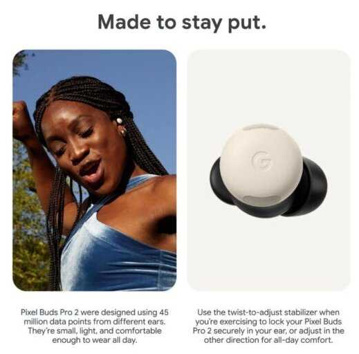 Форма Pixel Buds Pro 2 отличается от предыдущей версии — они менее массивные и легче, что большинство пользователей оценивает как улучшение. Однако для интенсивных нагрузок вроде бега свыше 10 км фиксация может быть недостаточной: наушники требуют периодической корректировки, особенно при резких движениях. Владельцам с крупной анатомией ушной раковины рекомендуется протестировать посадку, так как некоторым модель не подходит. -