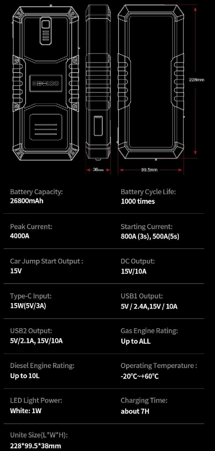 Характеристи GOOLOO Пусковое устройство (18000 мАч, 1200 А)