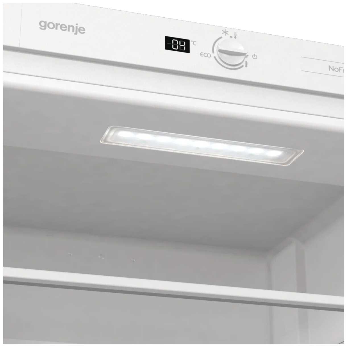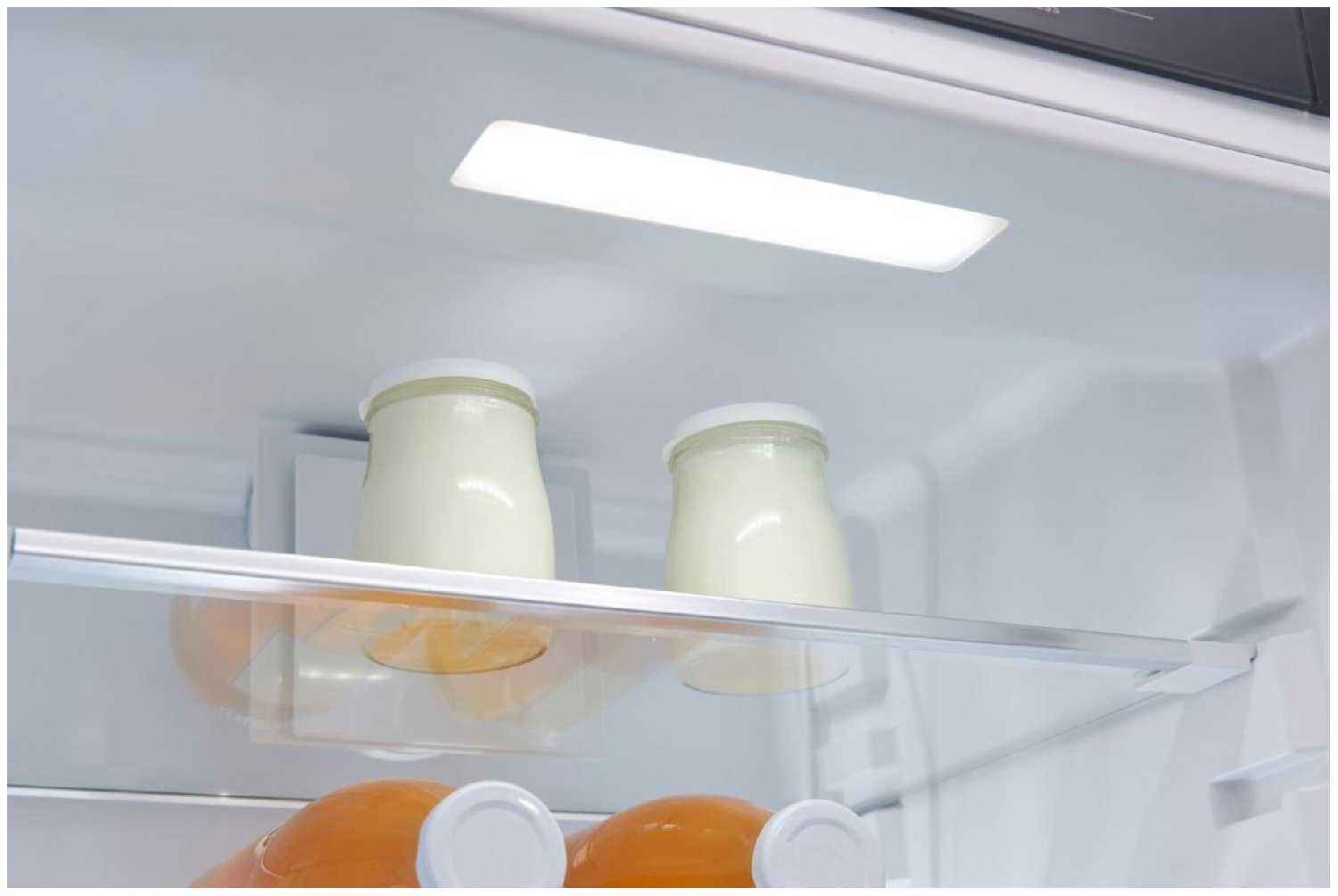 Верхняя светодиодная лампа дает равномерную подсветку без теневых зон, позволяя различать содержимое дальних полок. При длительном открытии дверцы срабатывает световой индикатор (мигание), а не звуковой сигнал – это преимущество для ночного использования. -