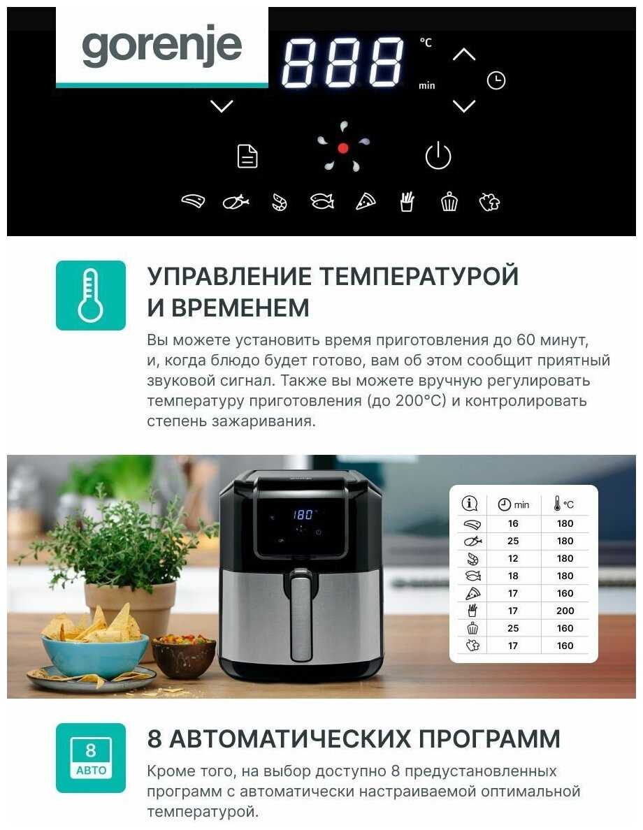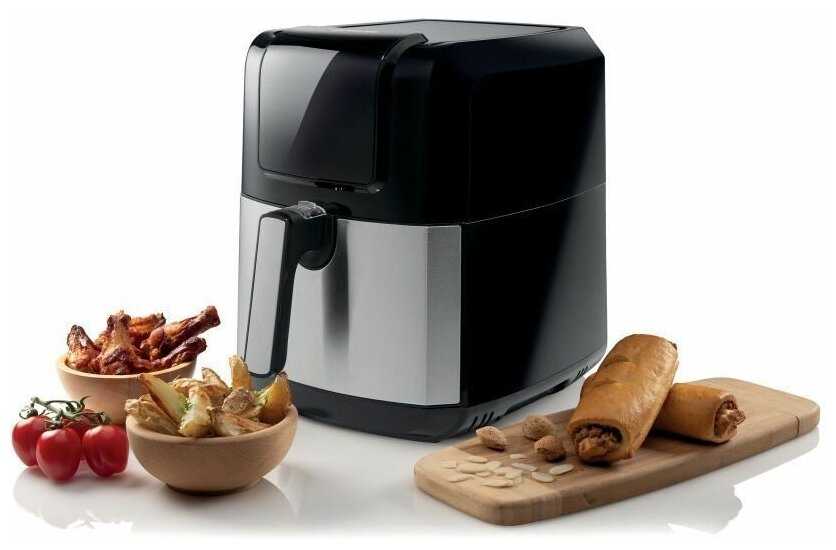 - Позволяет готовить порции для 4-6 человек (1 кг картофеля фри, 6 куриных бёдер).