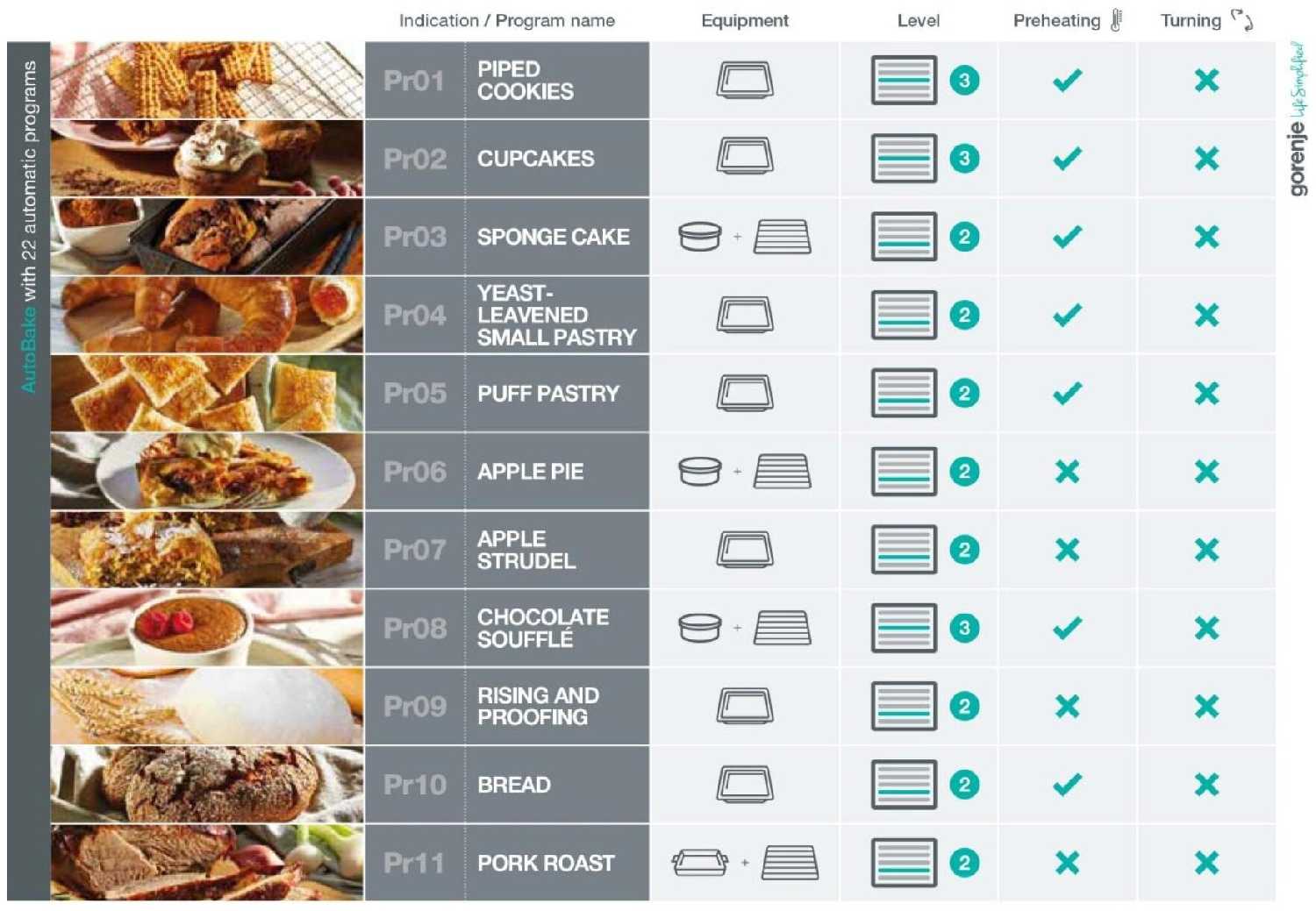 - + Электрический духовой шкаф имеет 22 автоматические программы Auto Bake. Благодаря этому пользователю не нужно вручную выбирать настройки, оптимальные для приготовления определенного блюда.