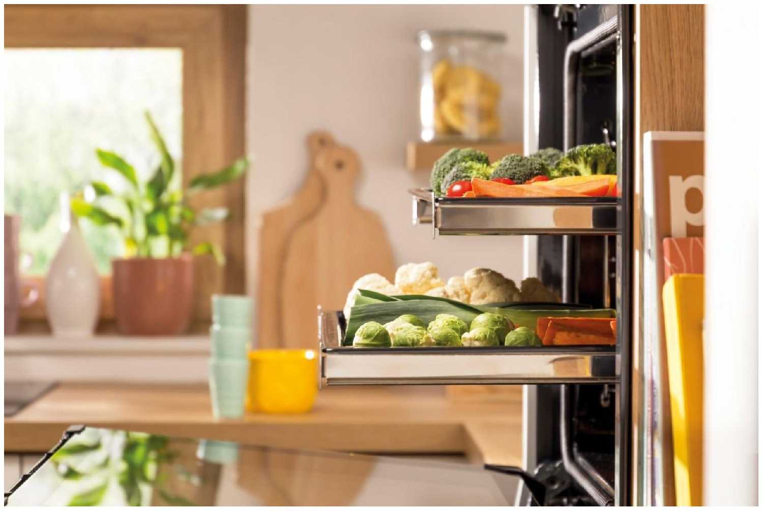 - Два уровня направляющих с плавным выдвижением позволяют безопасно размещать противни. В комплекте — три противня (глубокий, перфорированный, стандартный) и решетка.