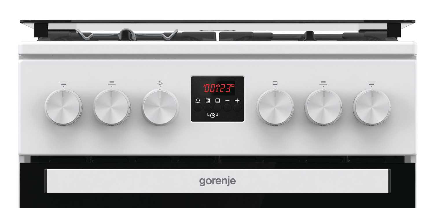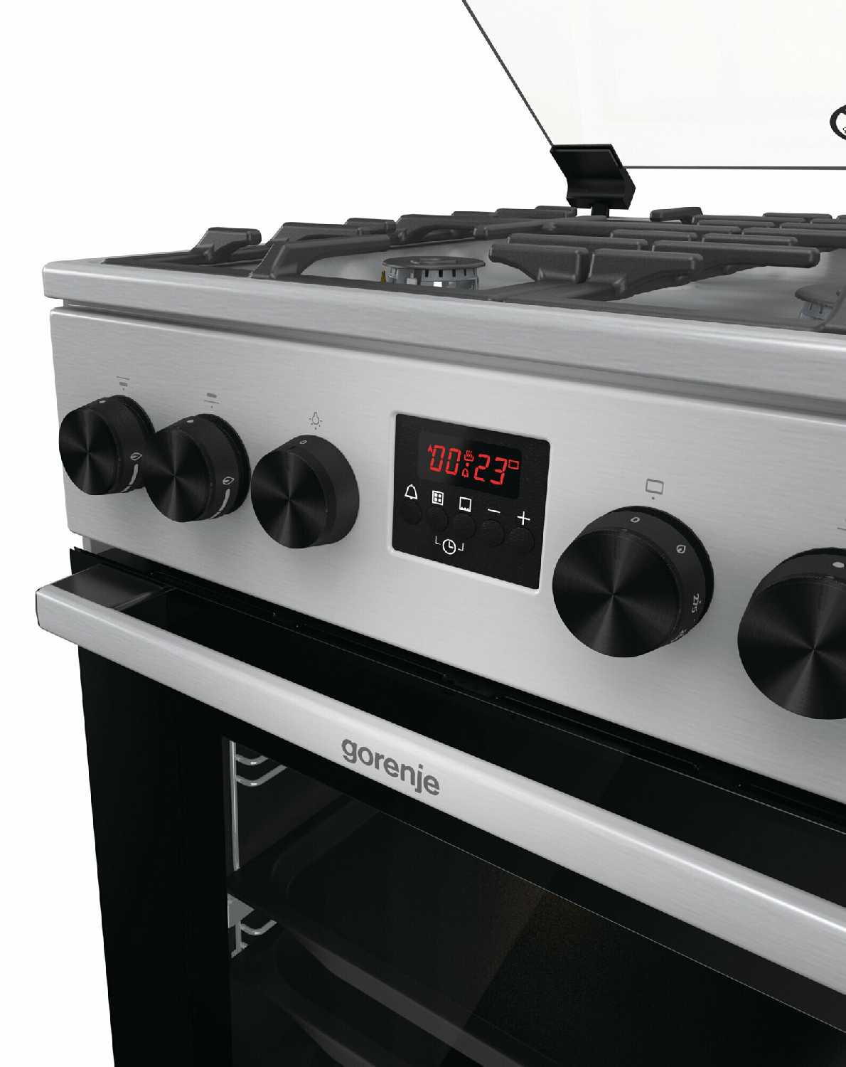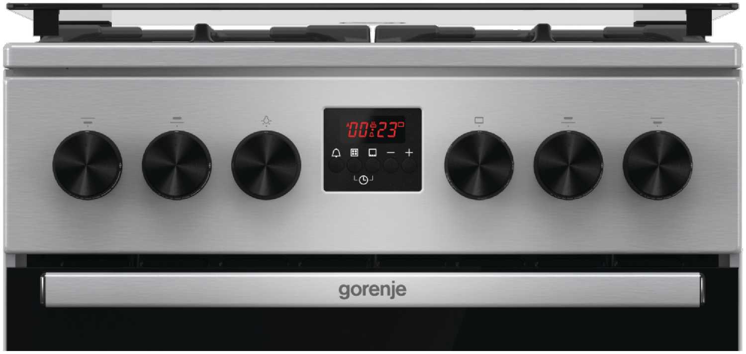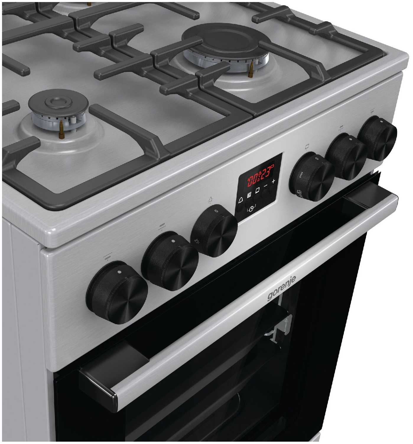Топовая в линейке плита, оснащенная термостатированной духовкой, газовым грилем, газконтролем и автоподжигом всего. Из за газового гриля сзади в режиме гриля/духовки выходит воздух под 100 градусов, там у плиты выхлопная труба позволяющая работать в режиме гриля при закрытой дверце, так что если у вас нет фартука из плитки возможны печальные последствия для стены. Ящик под плитой так же через большие отверстия соединяется с дном горелки духовки, так что хранить там легковоспламенимые предметы нежелательно. Вся фурнитура управления газом итальянская, включая горелки, таймер - Словения. Печет плита очень неплохо, если не забывать что духовке нужно время на нагрев, гриль позволяет готовить быстро всякие вкусности, главное не забывать за ним следить, мощность у него не регулируемая. Решетки конфорок - не проволочка по которой все скользит, а нормальный чугун. Таймеры до 3 часов на все, кроме гриля. Про страшный свист плиты не более чем анекдот от конкурентов, любая газовая горелка шумит, эти не исключение. Газовый гриль, это не вертел, в этой модели вращающегося вертела нет. - - Металл плиты тонкий, монтаж внутри плиты по ощущениям делали люди весьма далекие от техники - бессистемная мешанина под крышкой. Качество сборки ниже всякой критики - например в моем экземпляре, плиты забыли зафиксировать провод датчика термоконтроля духовки, в результате чего она сразу же отключалась. Провод на отключение духовки по таймеру был вставлен задом наперед, поэтому из за плохого контакта не всегда срабатывало отключение по таймеру. На металле обратной стороны ящика под духовкой - следы окислов. Под крышкой плиты горелки висят в воздухе, они просто прикручиваются к верхней крышке, а не пластине под ней, между горелками и крышкой нет уплотнителей, так что если зальете, то все потечет внутрь плиты. Покупка в 2018 году Gorenje китайской компанией Hisense не пошла ей на пользу.