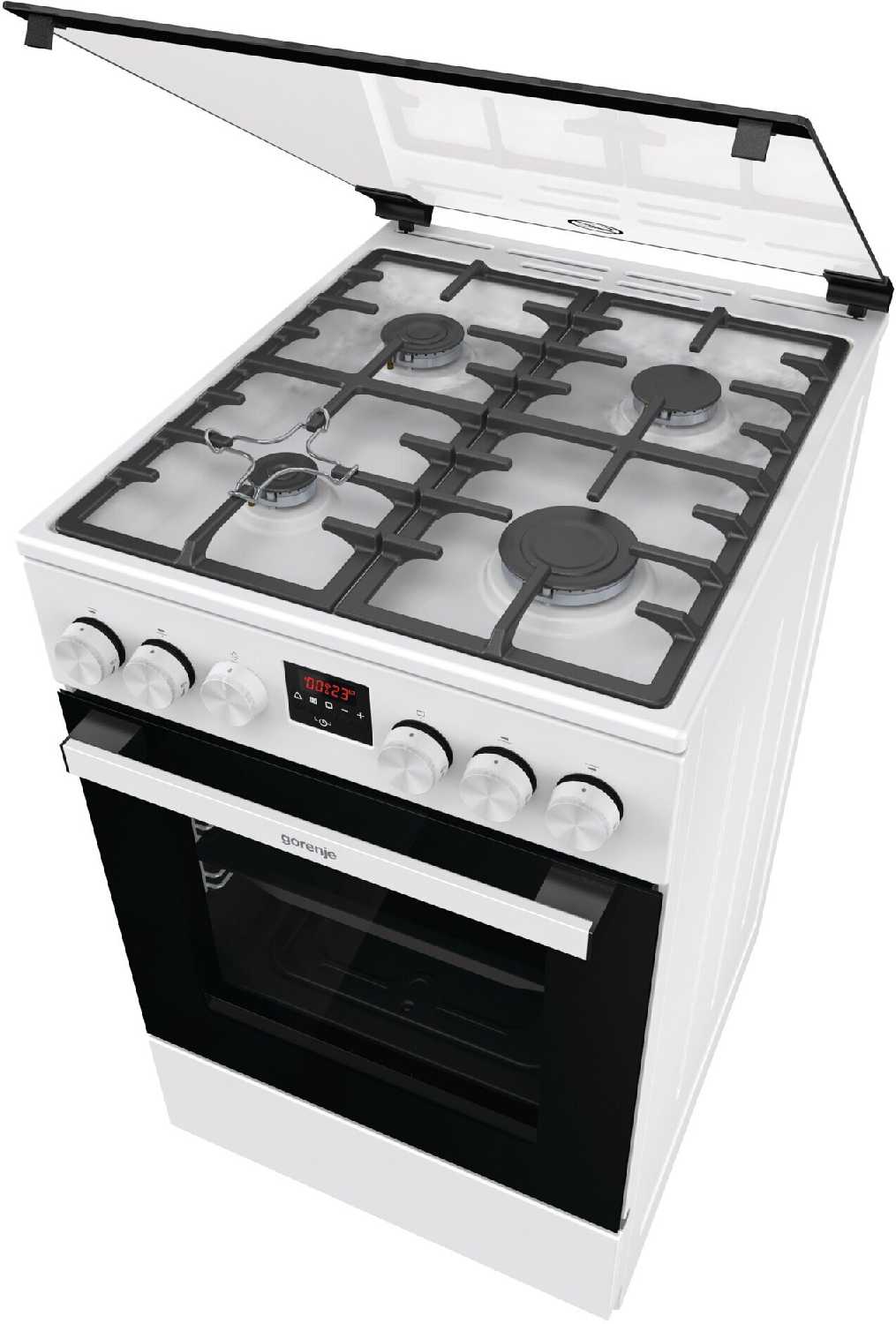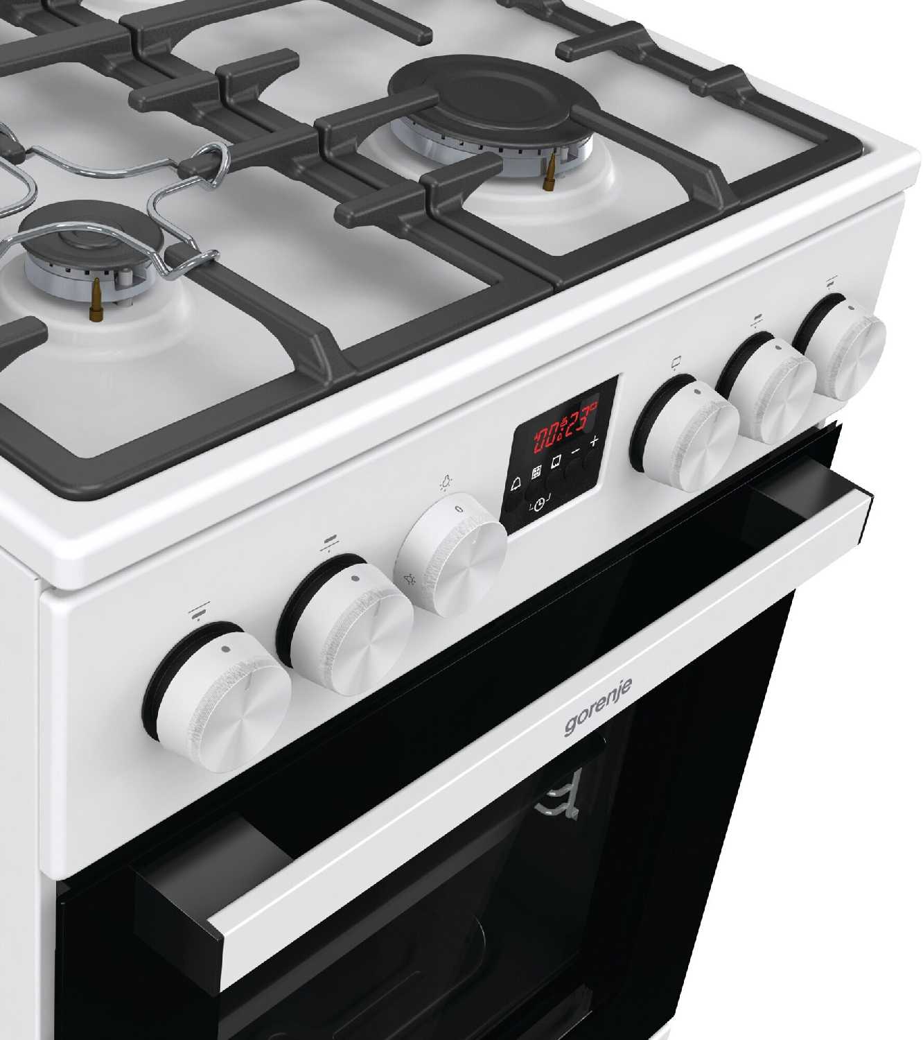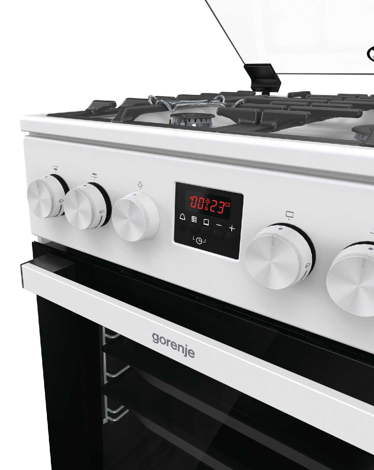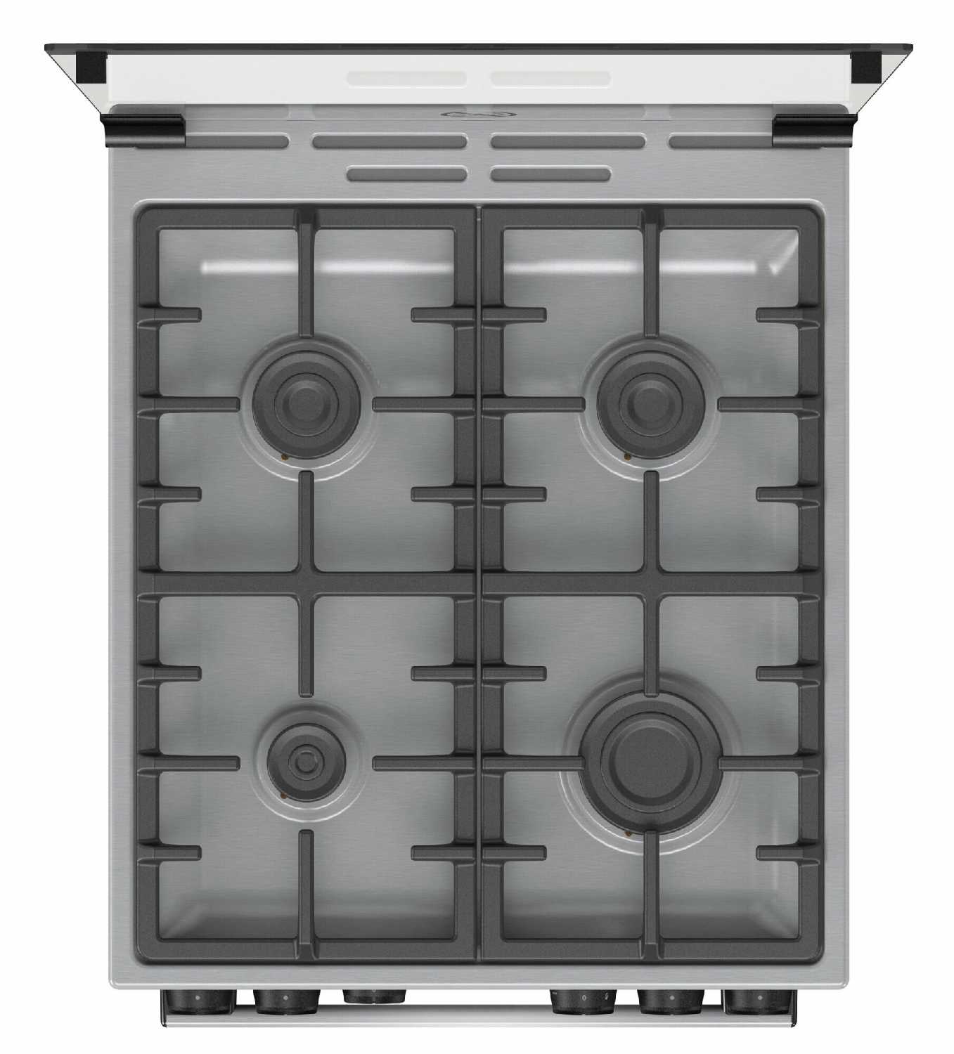 Топовая в линейке плита, оснащенная термостатированной духовкой, газовым грилем, газконтролем и автоподжигом всего. Из за газового гриля сзади в режиме гриля/духовки выходит воздух под 100 градусов, там у плиты выхлопная труба позволяющая работать в режиме гриля при закрытой дверце, так что если у вас нет фартука из плитки возможны печальные последствия для стены. Ящик под плитой так же через большие отверстия соединяется с дном горелки духовки, так что хранить там легковоспламенимые предметы нежелательно. Вся фурнитура управления газом итальянская, включая горелки, таймер - Словения. Печет плита очень неплохо, если не забывать что духовке нужно время на нагрев, гриль позволяет готовить быстро всякие вкусности, главное не забывать за ним следить, мощность у него не регулируемая. Решетки конфорок - не проволочка по которой все скользит, а нормальный чугун. Таймеры до 3 часов на все, кроме гриля. Про страшный свист плиты не более чем анекдот от конкурентов, любая газовая горелка шумит, эти не исключение. Газовый гриль, это не вертел, в этой модели вращающегося вертела нет. - - Металл плиты тонкий, монтаж внутри плиты по ощущениям делали люди весьма далекие от техники - бессистемная мешанина под крышкой. Качество сборки ниже всякой критики - например в моем экземпляре, плиты забыли зафиксировать провод датчика термоконтроля духовки, в результате чего она сразу же отключалась. Провод на отключение духовки по таймеру был вставлен задом наперед, поэтому из за плохого контакта не всегда срабатывало отключение по таймеру. На металле обратной стороны ящика под духовкой - следы окислов. Под крышкой плиты горелки висят в воздухе, они просто прикручиваются к верхней крышке, а не пластине под ней, между горелками и крышкой нет уплотнителей, так что если зальете, то все потечет внутрь плиты. Покупка в 2018 году Gorenje китайской компанией Hisense не пошла ей на пользу.