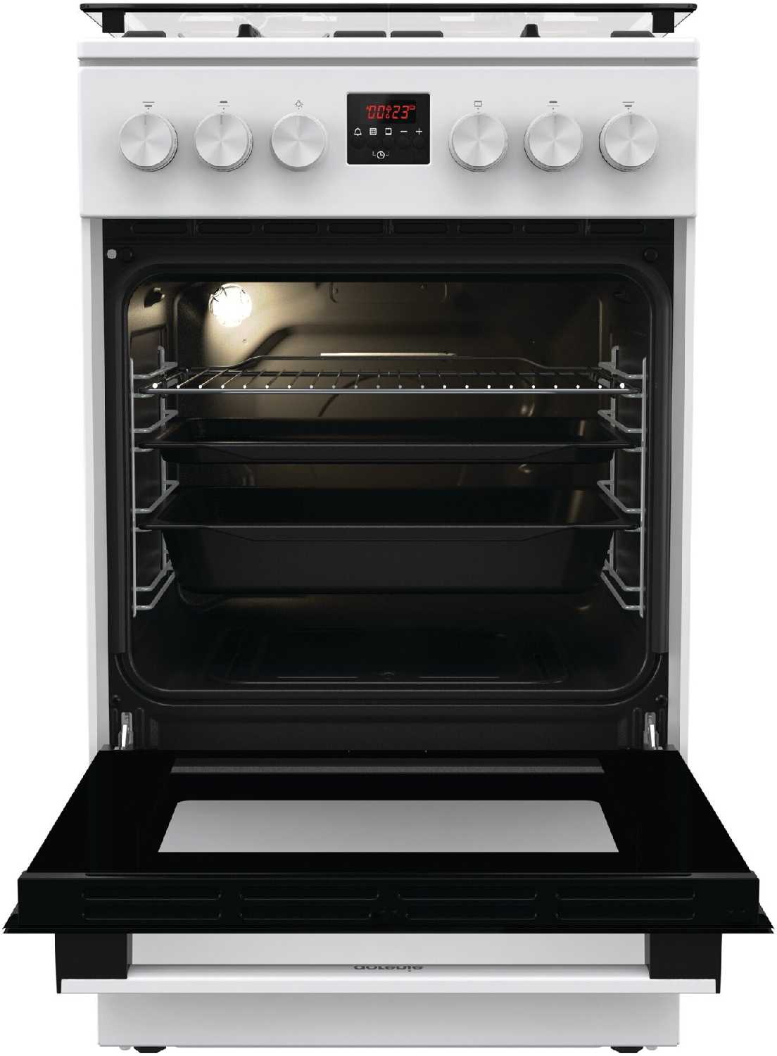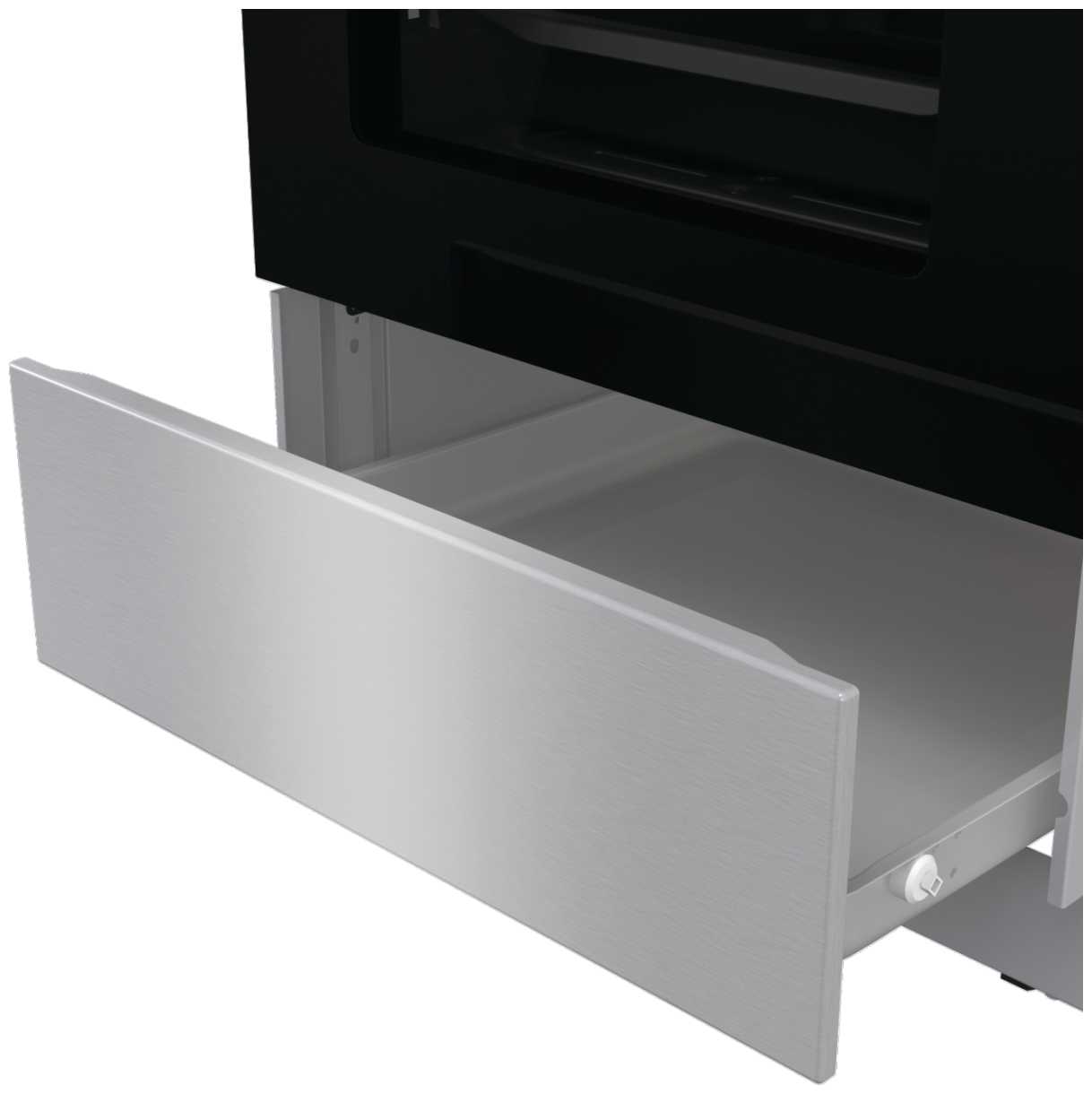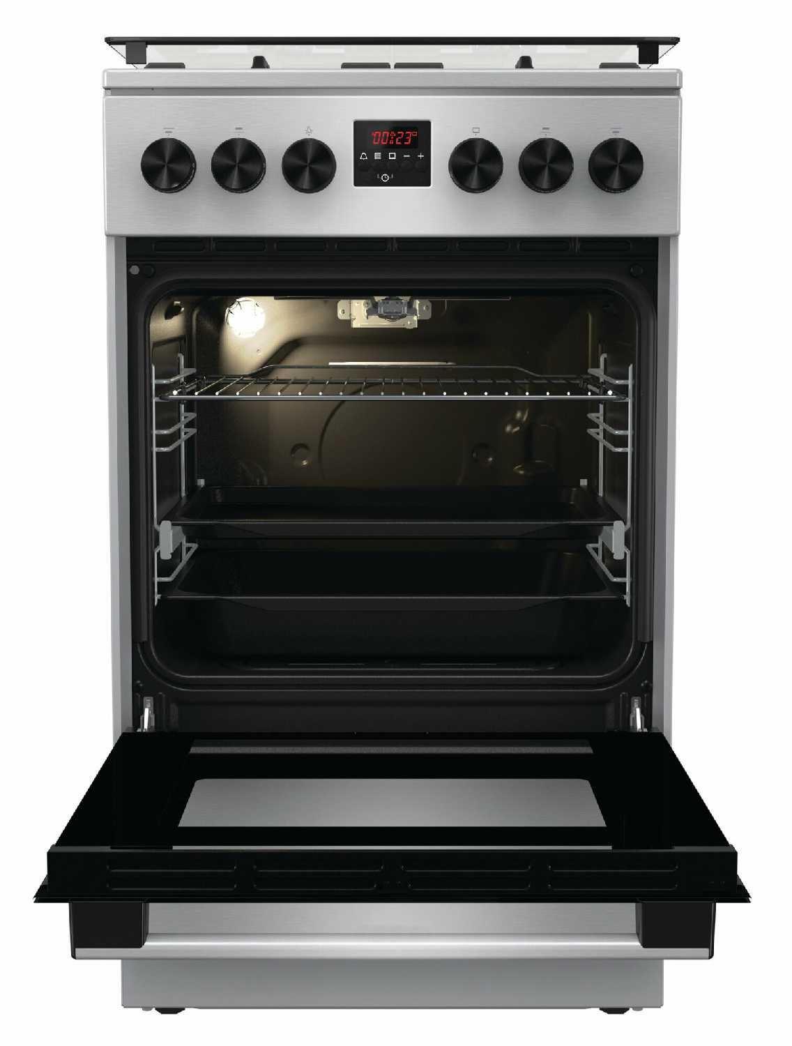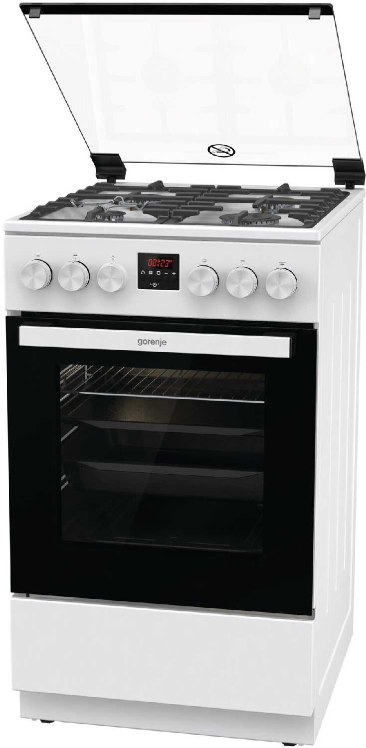 Топовая в линейке плита, оснащенная термостатированной духовкой, газовым грилем, газконтролем и автоподжигом всего. Из за газового гриля сзади в режиме гриля/духовки выходит воздух под 100 градусов, там у плиты выхлопная труба позволяющая работать в режиме гриля при закрытой дверце, так что если у вас нет фартука из плитки возможны печальные последствия для стены. Ящик под плитой так же через большие отверстия соединяется с дном горелки духовки, так что хранить там легковоспламенимые предметы нежелательно. Вся фурнитура управления газом итальянская, включая горелки, таймер - Словения. Печет плита очень неплохо, если не забывать что духовке нужно время на нагрев, гриль позволяет готовить быстро всякие вкусности, главное не забывать за ним следить, мощность у него не регулируемая. Решетки конфорок - не проволочка по которой все скользит, а нормальный чугун. Таймеры до 3 часов на все, кроме гриля. Про страшный свист плиты не более чем анекдот от конкурентов, любая газовая горелка шумит, эти не исключение. Газовый гриль, это не вертел, в этой модели вращающегося вертела нет. - - Металл плиты тонкий, монтаж внутри плиты по ощущениям делали люди весьма далекие от техники - бессистемная мешанина под крышкой. Качество сборки ниже всякой критики - например в моем экземпляре, плиты забыли зафиксировать провод датчика термоконтроля духовки, в результате чего она сразу же отключалась. Провод на отключение духовки по таймеру был вставлен задом наперед, поэтому из за плохого контакта не всегда срабатывало отключение по таймеру. На металле обратной стороны ящика под духовкой - следы окислов. Под крышкой плиты горелки висят в воздухе, они просто прикручиваются к верхней крышке, а не пластине под ней, между горелками и крышкой нет уплотнителей, так что если зальете, то все потечет внутрь плиты. Покупка в 2018 году Gorenje китайской компанией Hisense не пошла ей на пользу.