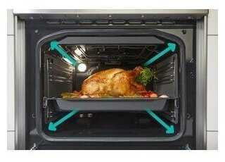 - Вентилятор конвекции обеспечивает циркуляцию воздуха, минимизируя разницу температуры между верхом и низом противня.