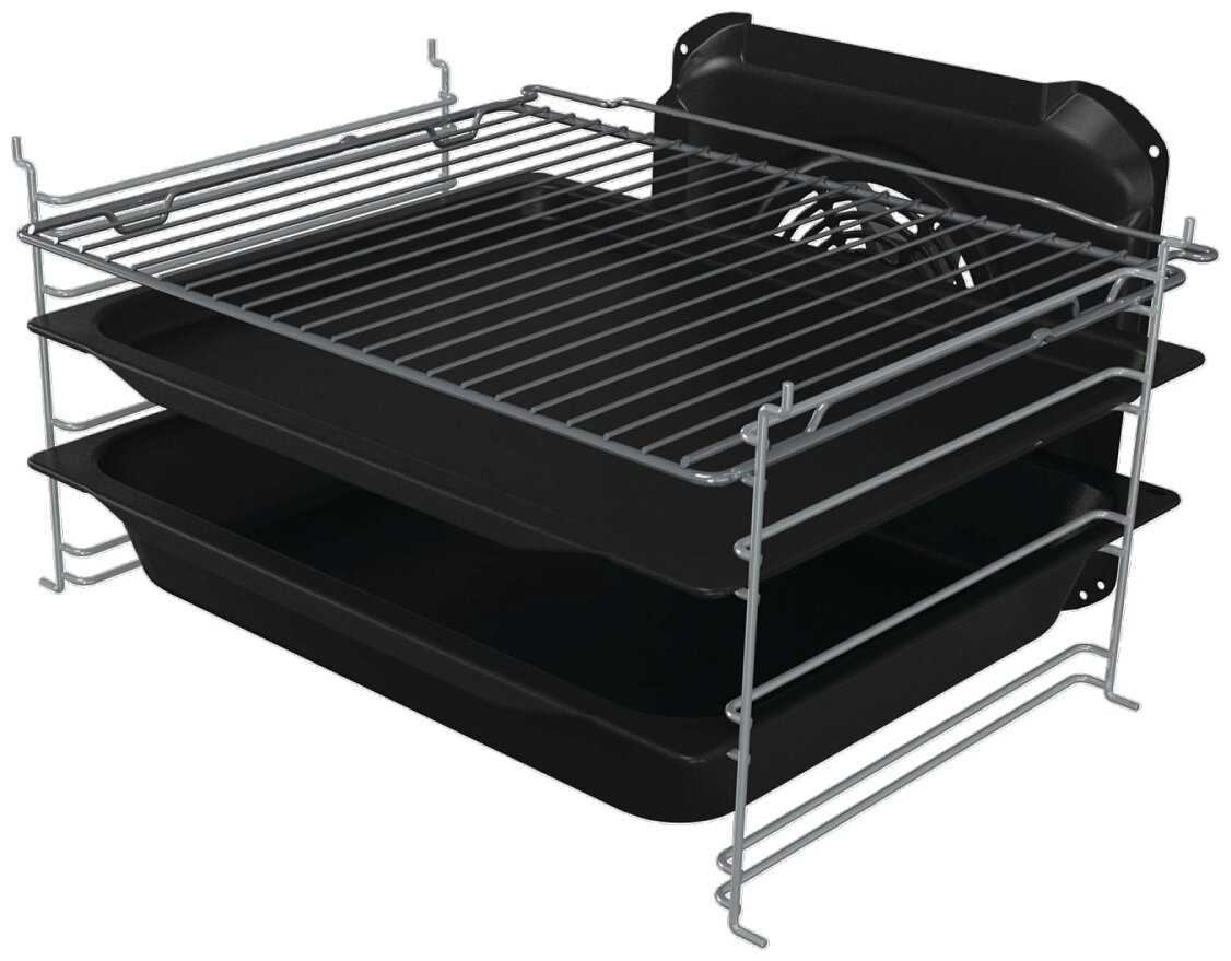 Объем 70 литров позволяет одновременно размещать 2 полноразмерных противня (глубокий и плоский) и решетку для гриля. Пользователи успешно готовят крупные блюда: индейки весом до 5 кг, многоярусные пироги, 4-6 порций курицы-гриль. Ящик для посуды под духовкой имеет полезную глубину 40 см. -