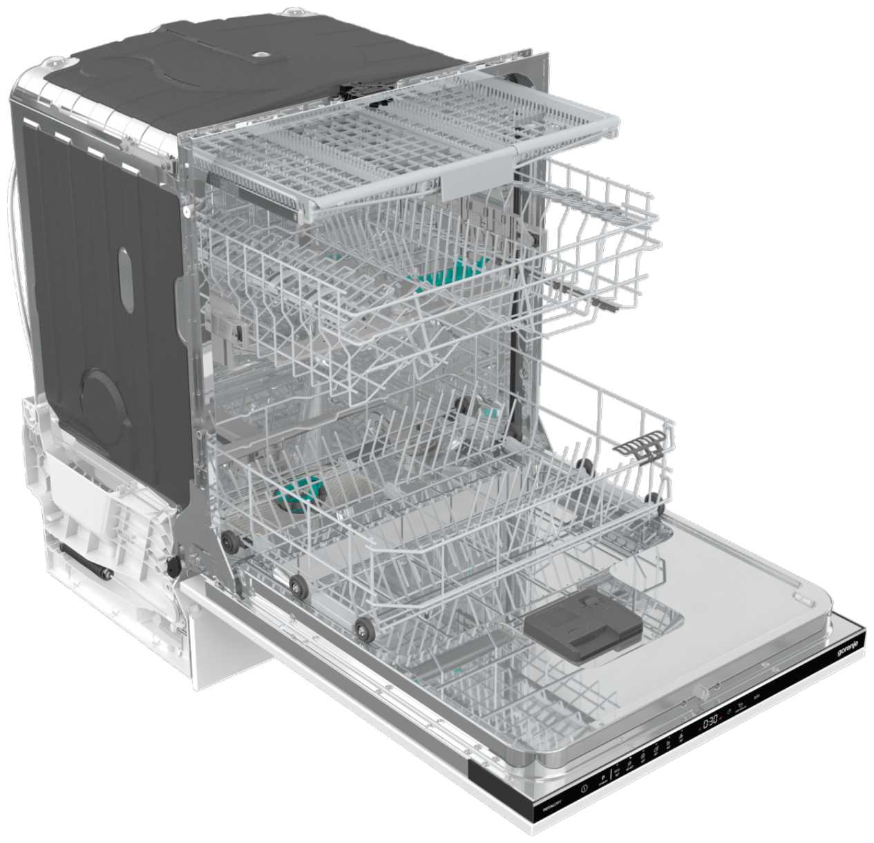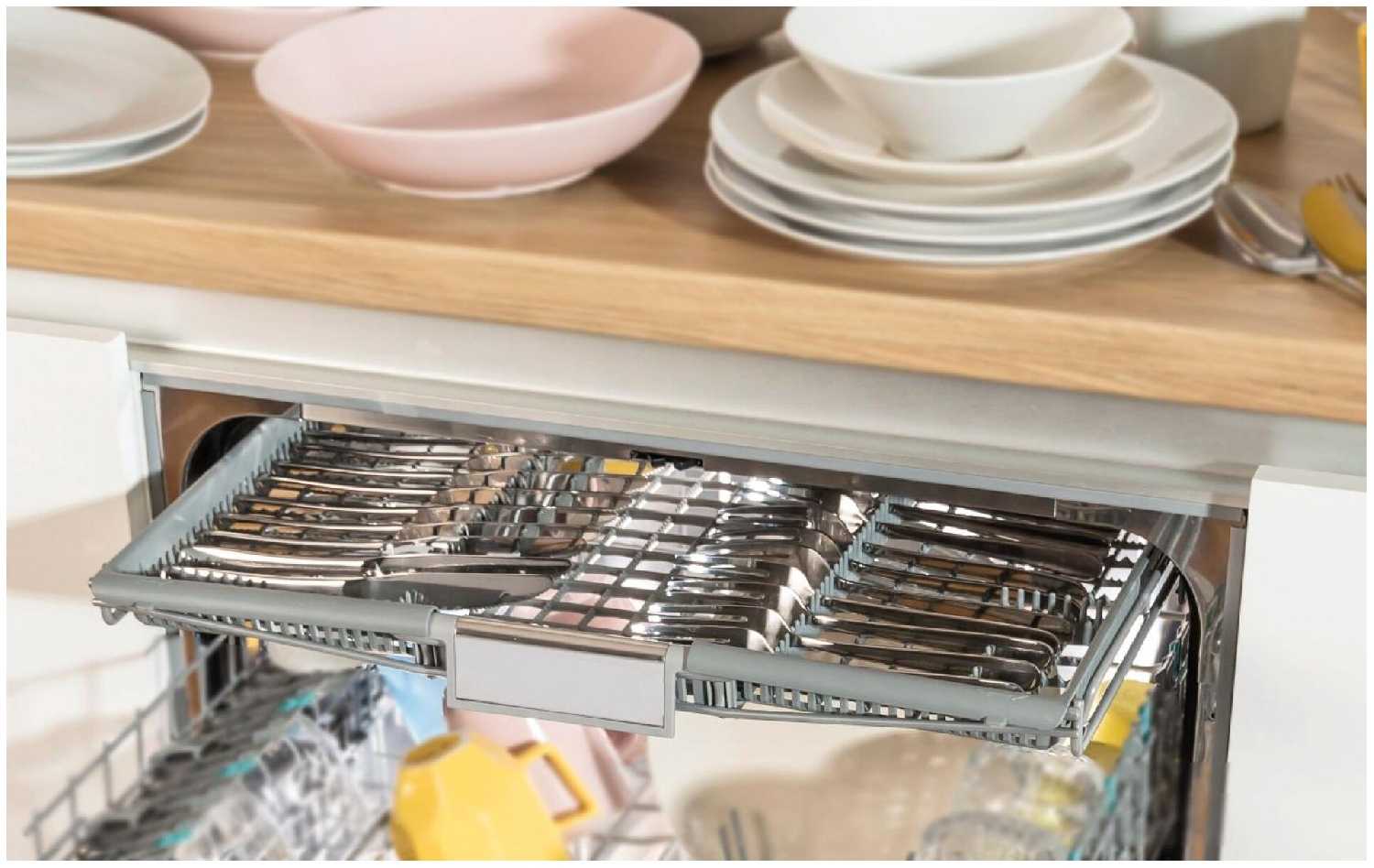 - Вмещает до 16 комплектов посуды благодаря трём корзинам, включая съёмный лоток для столовых приборов.