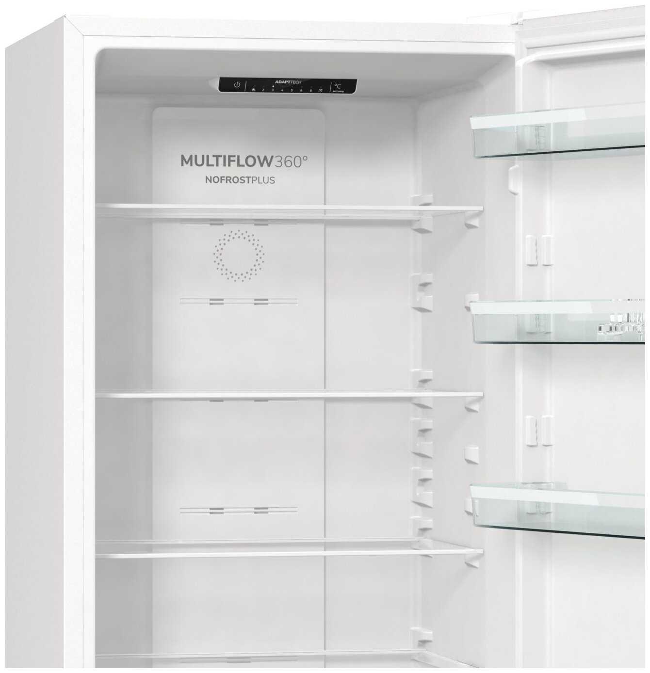 Конструкция предлагает гибкую адаптацию: пять стеклянных полок с регулировкой высоты (с шагом 4 см) позволяют размещать высокую посуду вроде кастрюль с крышками. Морозильная камера оснащена тремя глубокими ящиками и открытой полкой для быстрого доступа к заморозкам без выдвижения контейнеров. -