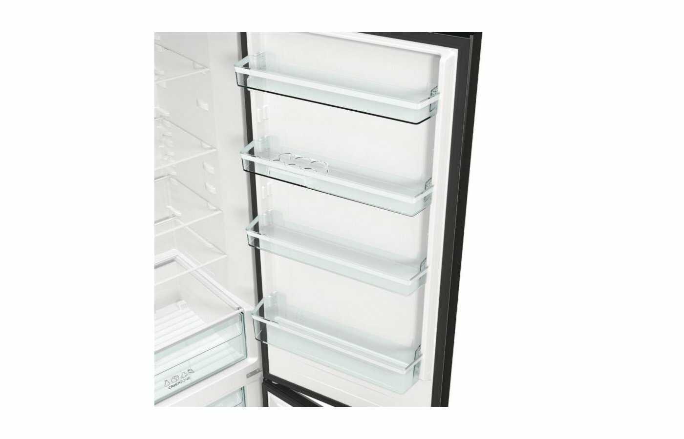 - Широкие боковые полки на дверцах вмещают двухлитровые бутылки и большие упаковки, упрощая доступ без риска опрокидывания и повышая удобство ежедневного использования.