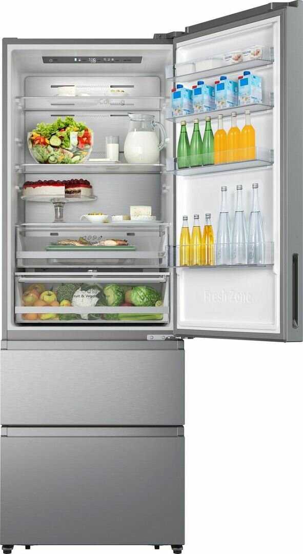 - Большой ящик для овощей с контролем влажности и отдельная зона свежести обеспечивают длительную сохранность фруктов, зелени и овощей без увядания.