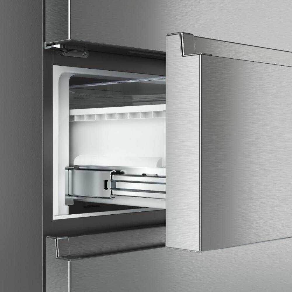 - Плавное выдвижение ящиков морозилки на роликовых направляющих и глубокая конструкция полок упрощают загрузку продуктов.