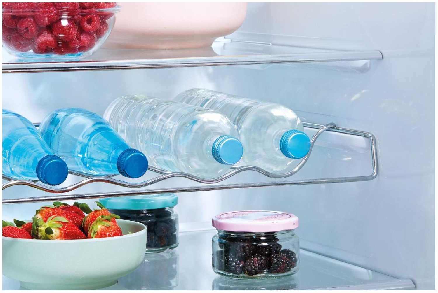 - Шаг регулировки — 8 см, что не позволяет оптимизировать пространство под бутылки высотой 35 см или многоярусные контейнеры.