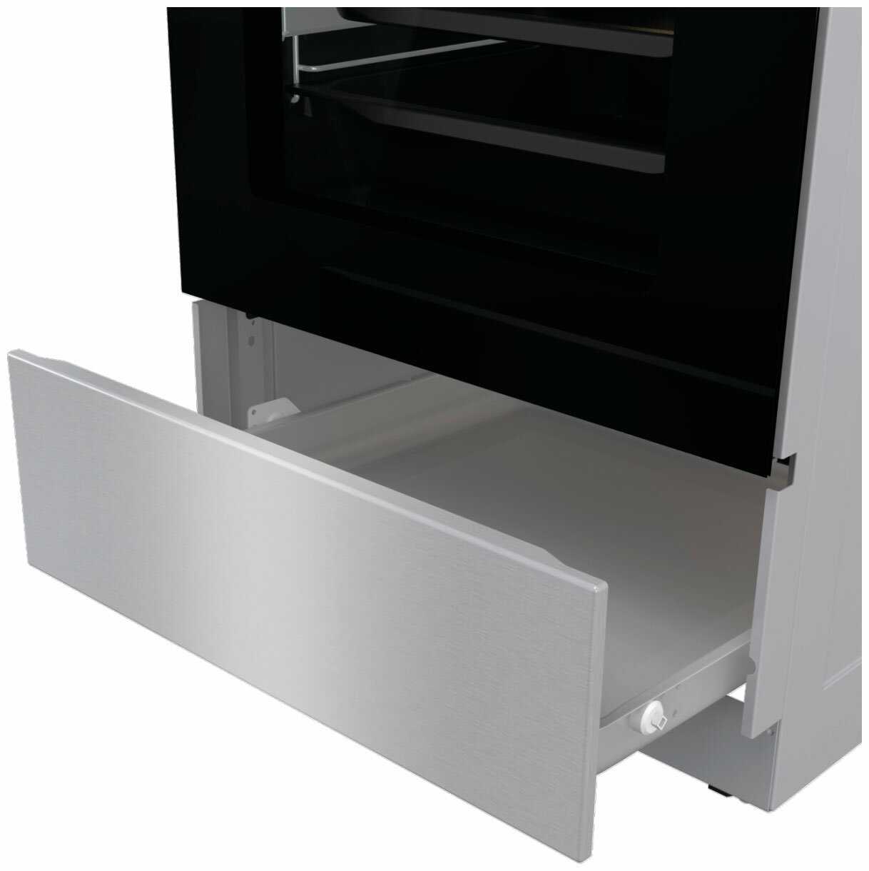 - Утапливаемые ручки управления духовкой и гладкая фронтальная панель упрощают процесс очистки и придают плите современный, минималистичный вид.