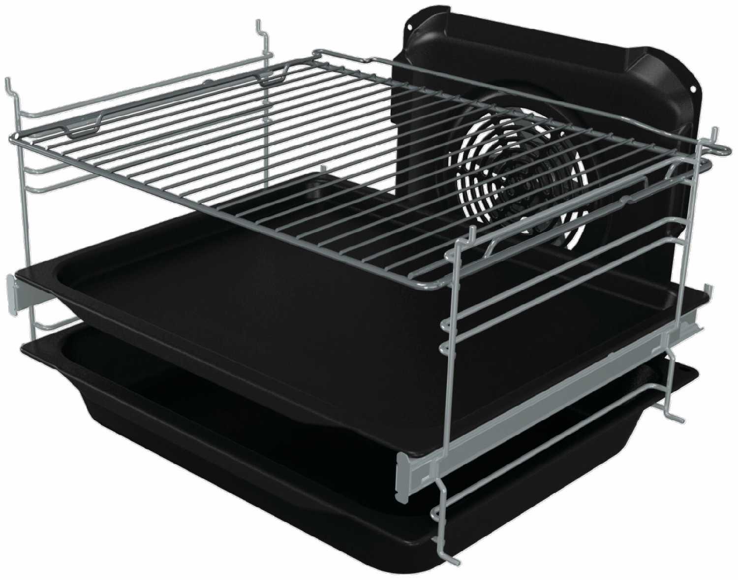 - В базовую комплектацию входят два противня (с высоким и низким бортом) и решетка, что избавляет от необходимости immediately докупать аксессуары.