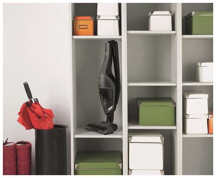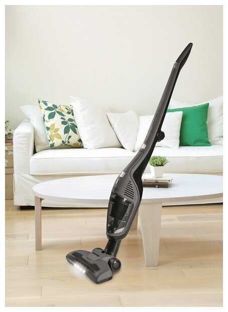 Щетка фиксируется, поэтому пылесос может самостоятельно стоять. Для своих функций весьма мощный. Батареи хватает на всю уборку. - - Отсутствуют