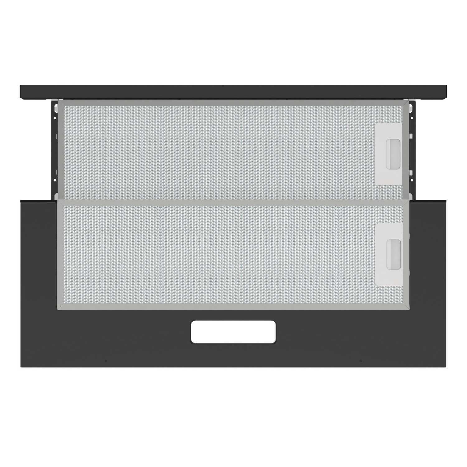 Компактный дизайн позволяет полностью встроить вытяжку в шкаф — в закрытом состоянии видна только тонкая планка. Черный цвет и лаконичные формы сочетаются с современной техникой. Металлические элементы (фильтры, рамка подсветки) добавляют стиля, не нарушая минимализм. -