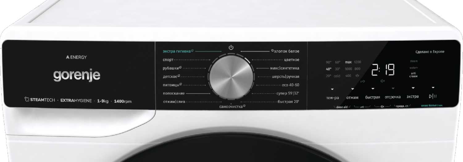 - + Загрузка до 9 кг, функции пара и антисминания, программа стирки за час.