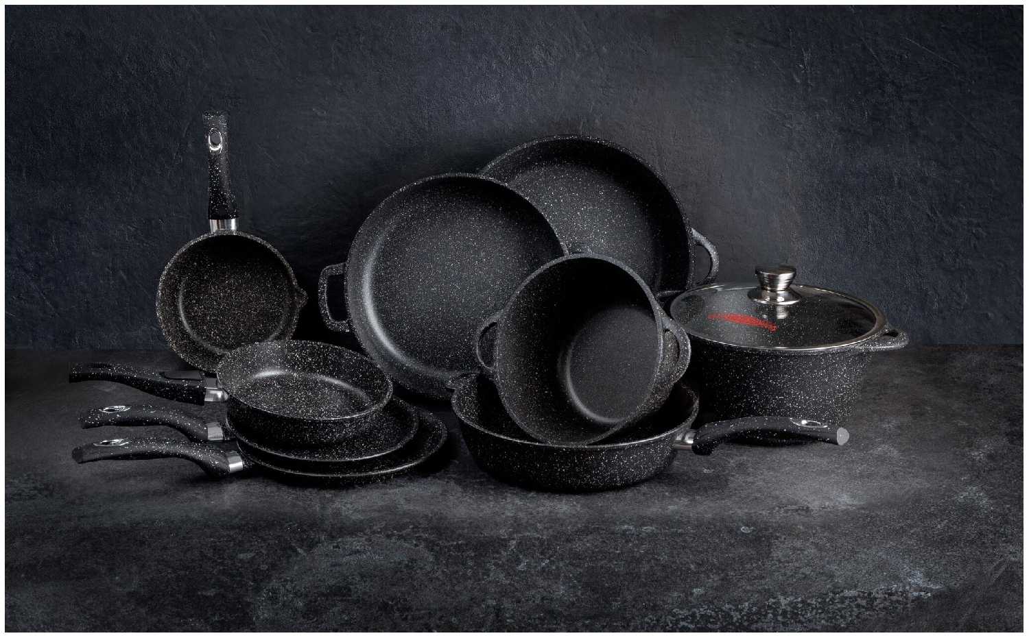 ну прекрасная сковорода, соответствует характеристикам. одна проблема, что то с диаметром не то. крышка на 26 см проваливается, на 28 большая. как то так, может поэтому цена занижена, но звёзду не снимаю. в работе понравилась.