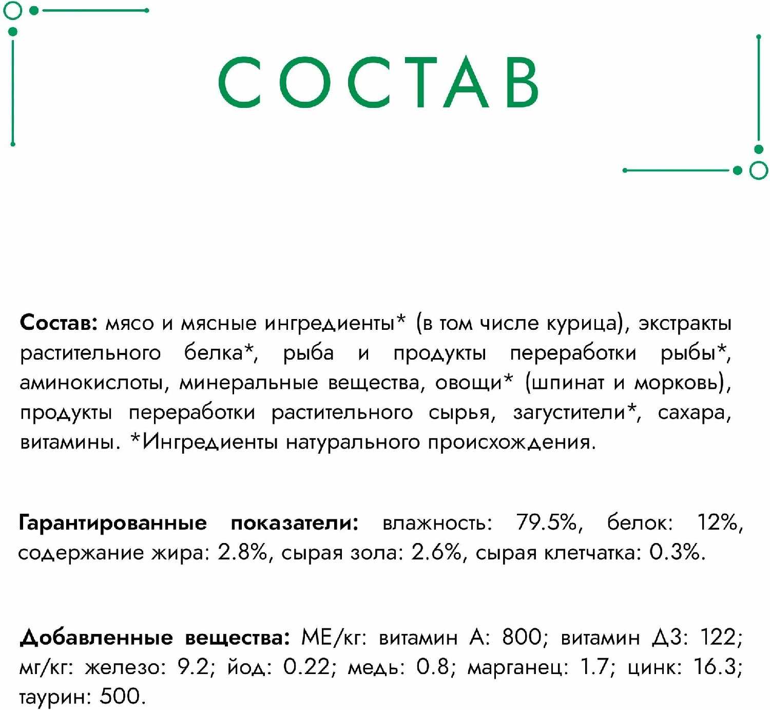 | Консистенция корма : | кусочки в желе, кусочки в соусе |