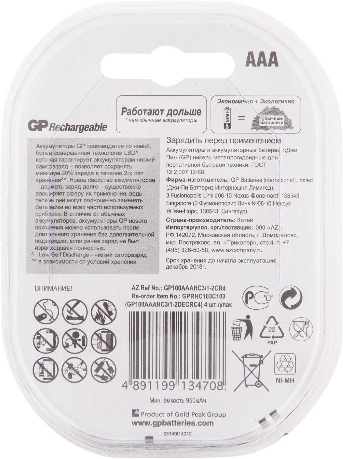 | Дополнительная информация : | Аккумуляторы GP нового поколения можно использовать после длительного хранения без дополнительной подзарядки, если ранее заряд не был израсходован полностью. |