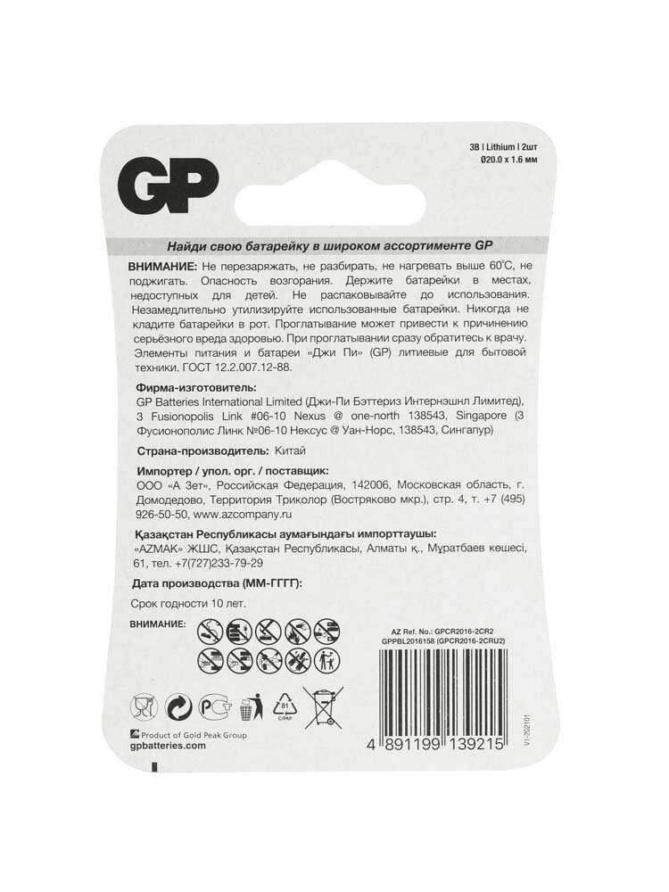 Дополнительная информация : | Батарейка GP CR2016-7CR2 2шт |