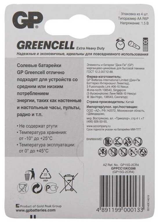 Характеристи GP Greencell AA (R06) 15S солевая, BL4, набор 4шт., 267815