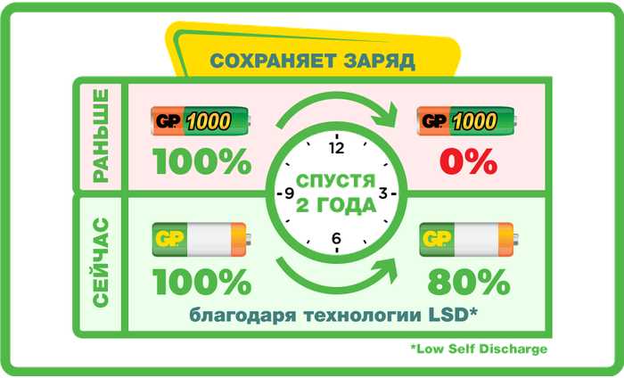 Дополнительная информация : | Аккумуляторы GP нового поколения можно использовать после длительного хранения без дополнительной подзарядки, если ранее заряд не был израсходован полностью. |