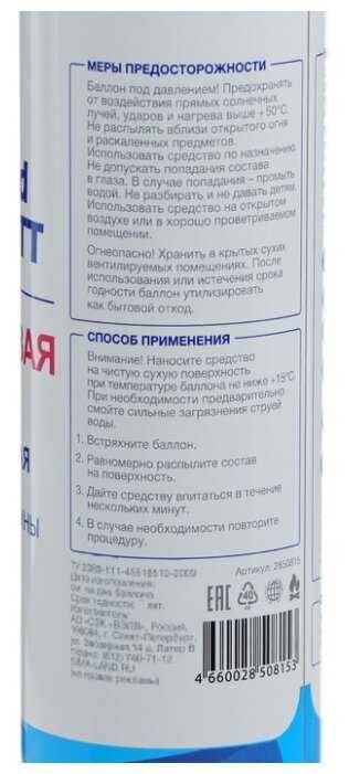 Способ применения : | Распылите средство на обрабатываемую поверхность при температуре баллона не ниже + 15 оС.Подождите 1-2 минуты.При необходимости повторите обработку. |