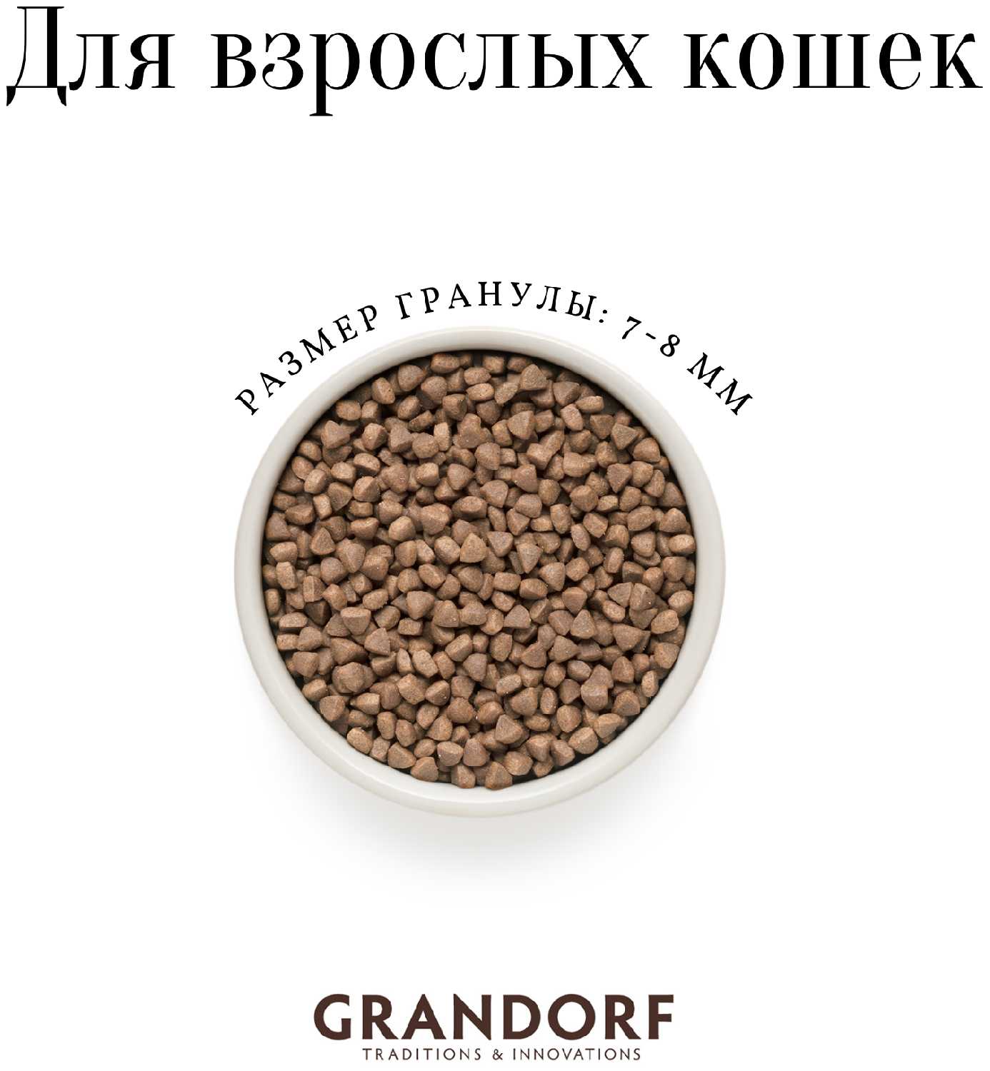 После долгого выбора корма, остановилась на данном виде Грандорф. После того, как стали пропадать корма на рынке, стало достаточно проблематично найти достойный корм. у Грандорф хороший состав. Я искала именно беззерновой. Кот ест корм с удовольствием. Думала будет тяжёлый переход с одного корма на другой. Но нет, я даже не заметила. Гранула хорошего размера и формы. Пахнет кормом, не противно. Кот чувствует себя на нем хорошо, шерсть блестящая