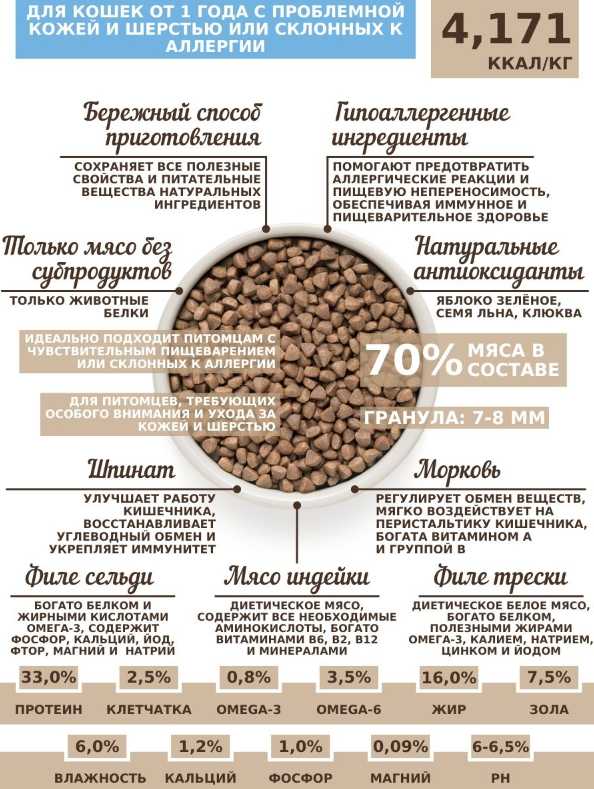 | Особые потребности : | беззерновой, гипоаллергенный, для вывода шерсти, для живущих в помещении, для живущих на улице, для здоровья кожи и блеска шерсти, для здоровья костей и суставов, для профилактики стресса, для снижения запаха стула, для стерилизованных/кастрированных, при чувствительном пищеварении, профилактика зубного камня, профилактика избыточного веса |