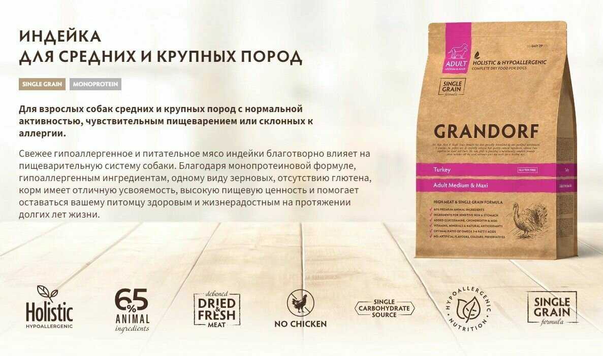 Для щенков рекомендуется начинать с линейки Grandorf Junior, а затем переходить на взрослый корм. Пожилым собакам он подходит при отсутствии противопоказаний по здоровью — лёгкая усвояемость и низкая калорийность предотвращают ожирение. Возрастных ограничений в отзывах не выявлено. -