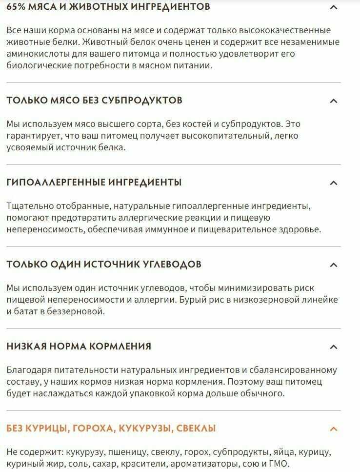 - Корм устраняет симптомы аллергии (зуд, слезоточивость глаз, кожные высыпания) благодаря отсутствию в составе курицы, бобовых, кукурузы, субпродуктов и искусственных добавок.