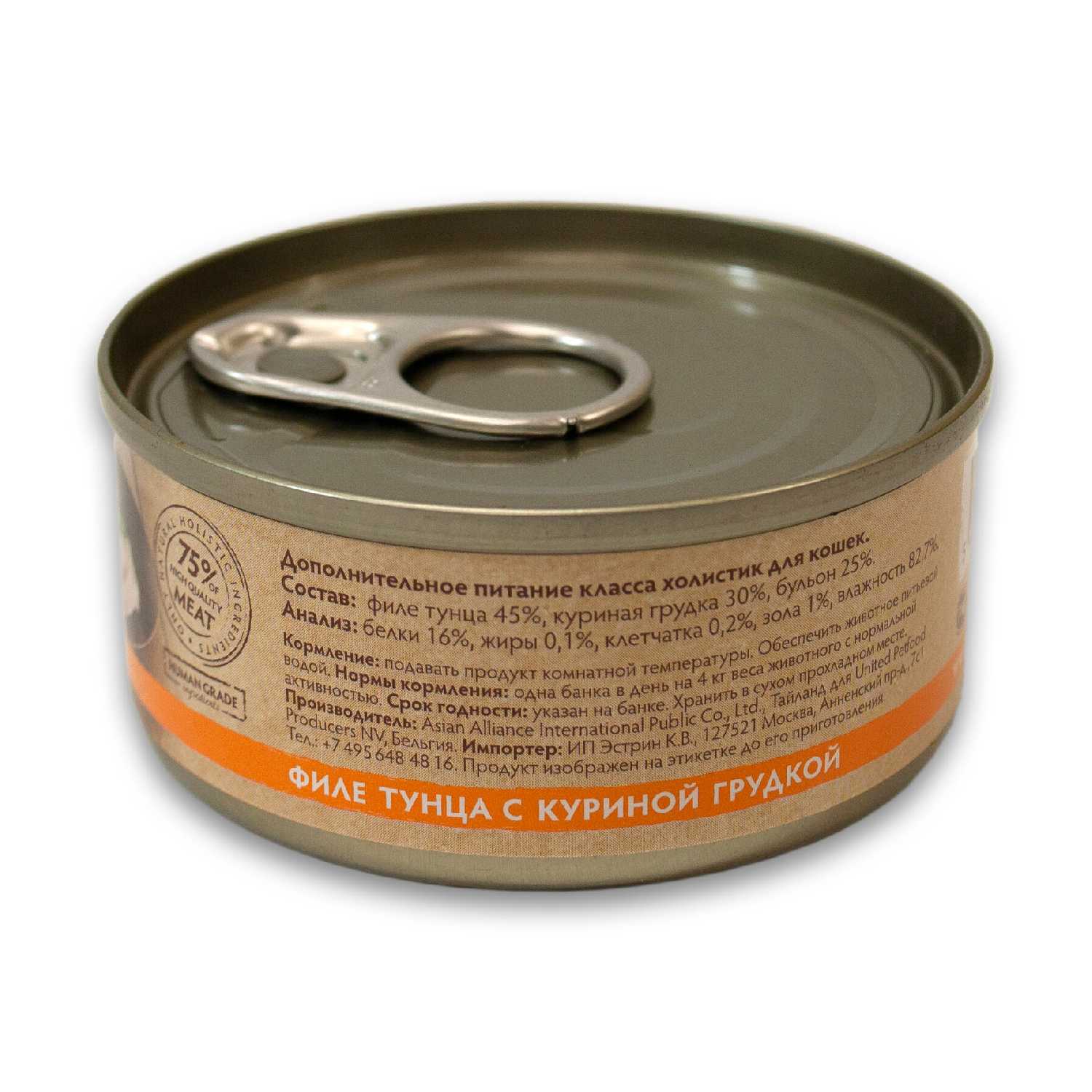 | Дополнительная информация : | - Увеличенный % добавок (куриная грудка) - 100% натуральные и свежие ингредиенты - 75% мяса в составе (45% филе тунца, 30% куриная грудка) - 0% зерновых (GRAIN FREE) - Ингредиенты класса HUMAN-GRADE пригодные в пищу человеку - Используются только филейные мясные и рыбные части - Деликатный способ приготовления (cохранены все питательные вещества) - Без гормонов, антибиотиков, консервантов, красителей, ароматизаторов и других добавок |