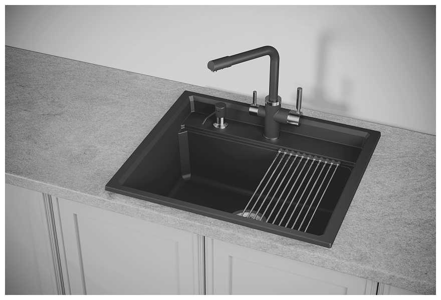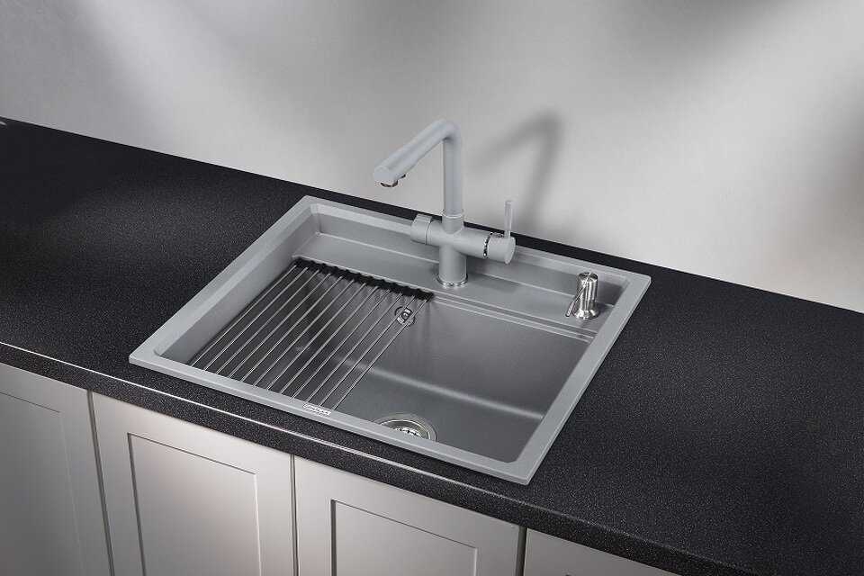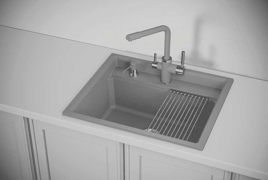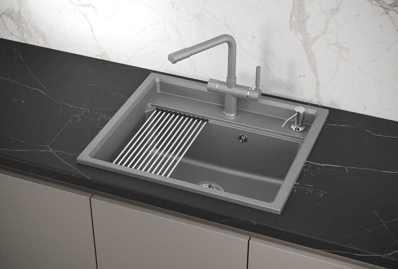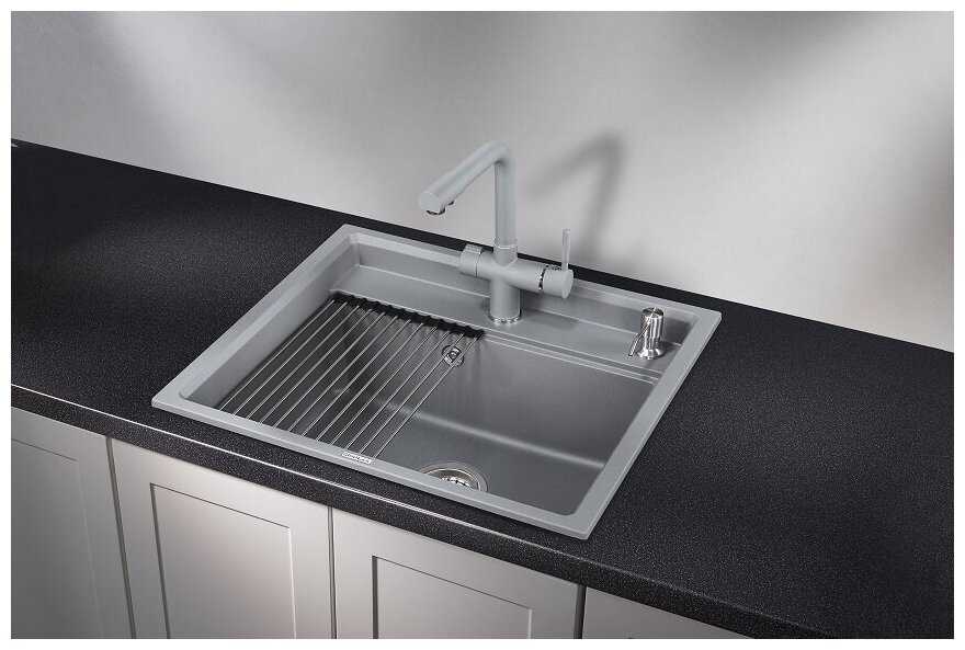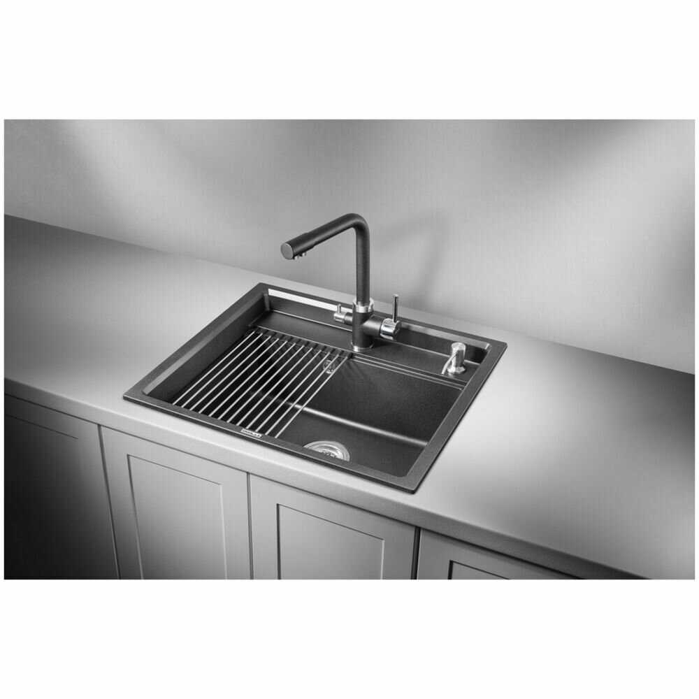 - + отличная раковина, пользоваться очень удобно, вода не разбрызгивается, ну и за счет того, что это почти каменная структура, не возникает мелких повреждений и царапин. также в комплекте двигающаяся подставка, на которой отлично стекает вода с помытой посуды или фруктов